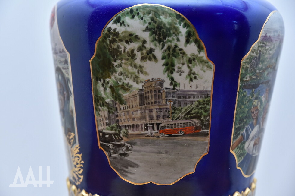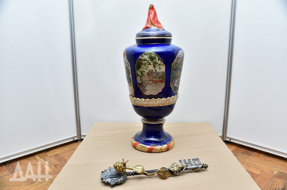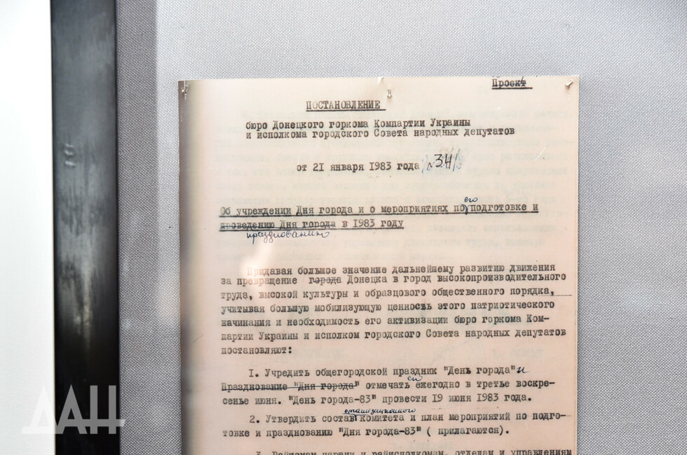 Привлекают внимание подарки шахтерской столице – большая керамическая расписная ваза 1957 года, изготовленная Константиновским керамическим заводом, а также символический ключ от города с кованой розой, сделанный к 140-летию Донецка. Завершают экспозицию фото празднования дня города в 1980-е годы. Этот праздник официально установлен в 1983 году (подробнее о празднике можно узнать в ранее опубликованном материале).