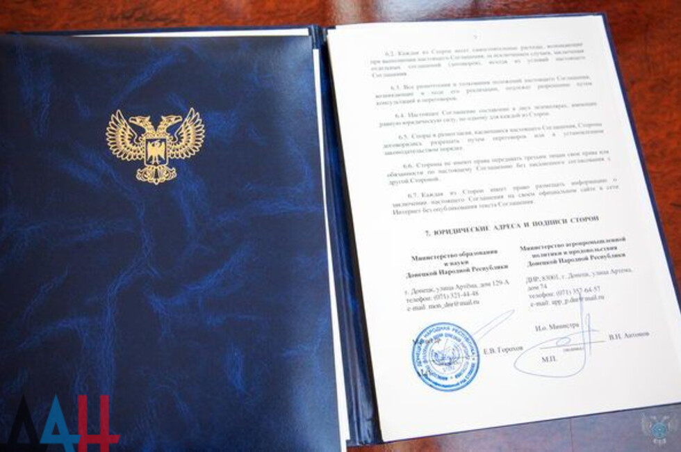 "Министр образования и науки Донецкой Народной Республики Евгений Горохов и исполняющий обязанности министра агропромышленной политики и продовольствия ДНР Владимир Антонов в среду, 30 мая, подписали соглашение о сотрудничестве между министерствами", - говорится в сообщении.