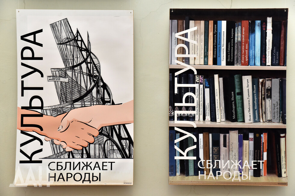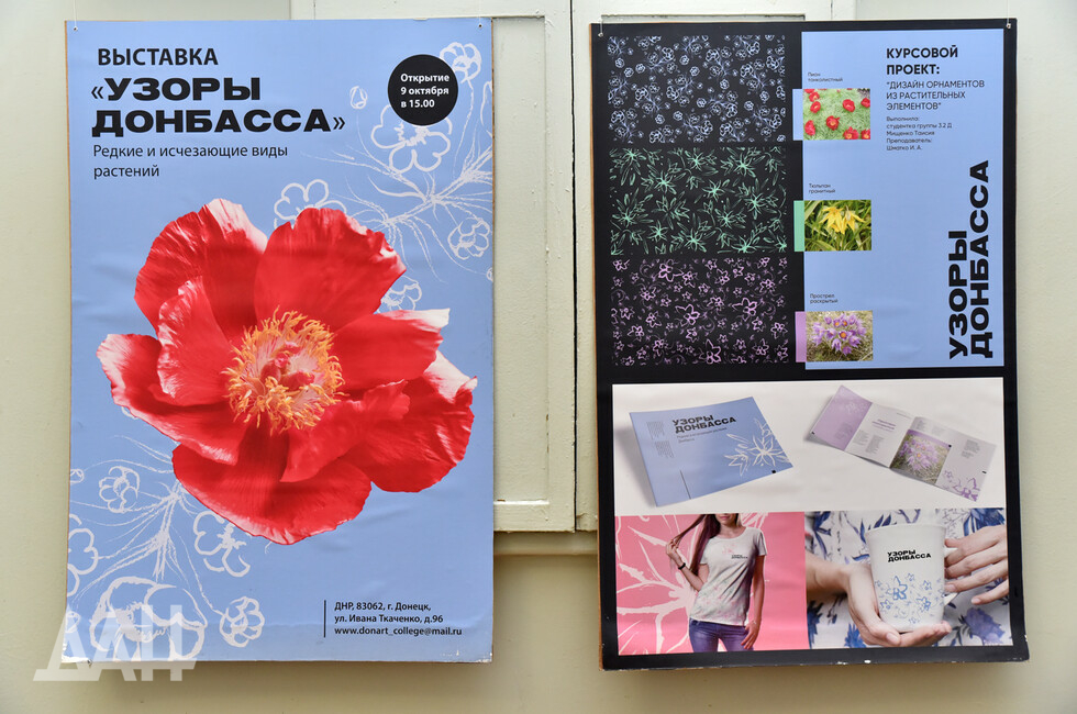 На выставке есть плакаты, посвященные Донбассу. Он видится авторам как трудовой край, стремящийся к миру. Использованы традиционные символы региона – уголь, шахтерская каска, поле пшеницы, каравай.