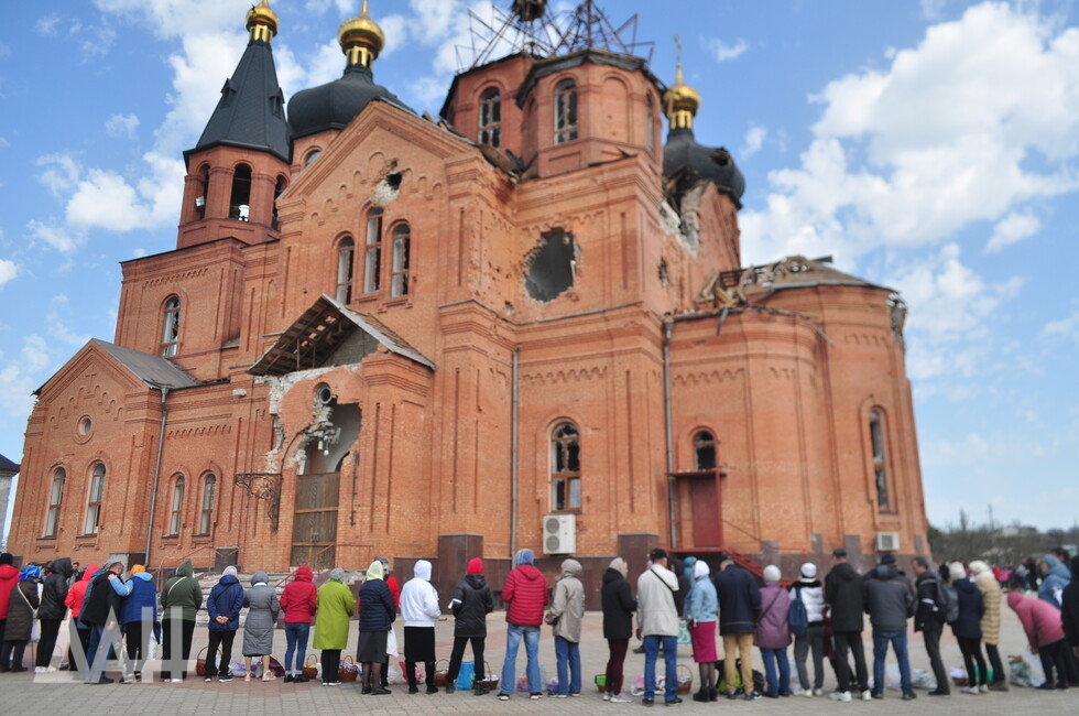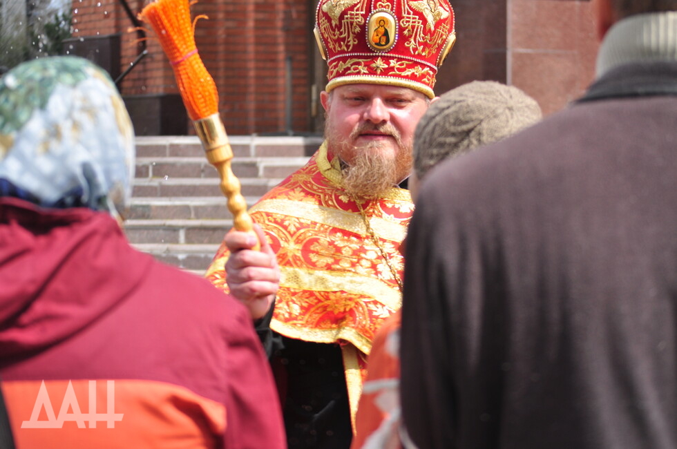 Также Пушилин поставил в храме свечу и поучаствовал в традиционном обряде освящения куличей, стоя в одном ряду с жителями Мариуполя.