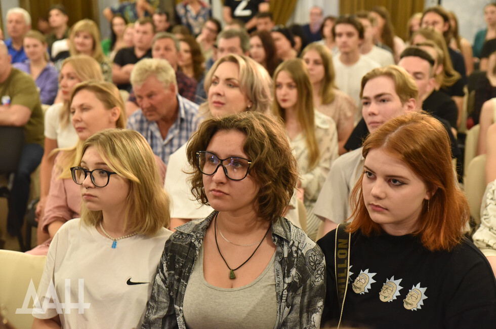 Артисты муздрамы и воспитанники школы-студии «Перспектива» с интересом слушали Машкова и задавали вопросы. После встречи было много желающих сфотографироваться с мэтром.