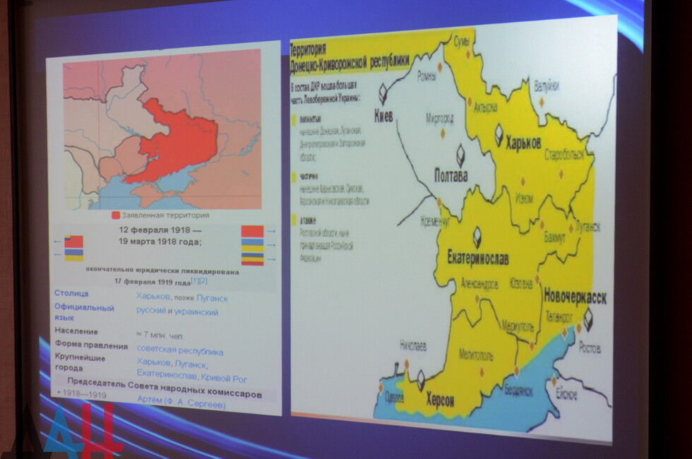 В частности, в донецком многопрофильном лицее №1 прошел открытый урок «Донецко-Криворожская республика: расстрелянная мечта». Занятие началось с просмотра информационной экспозиции, подготовленной учащимися. На стендах были представлены политическая карта и фотографии основателей ДКР.
