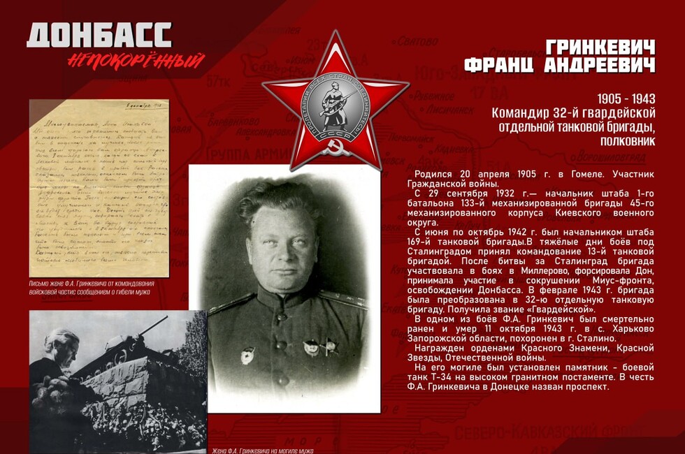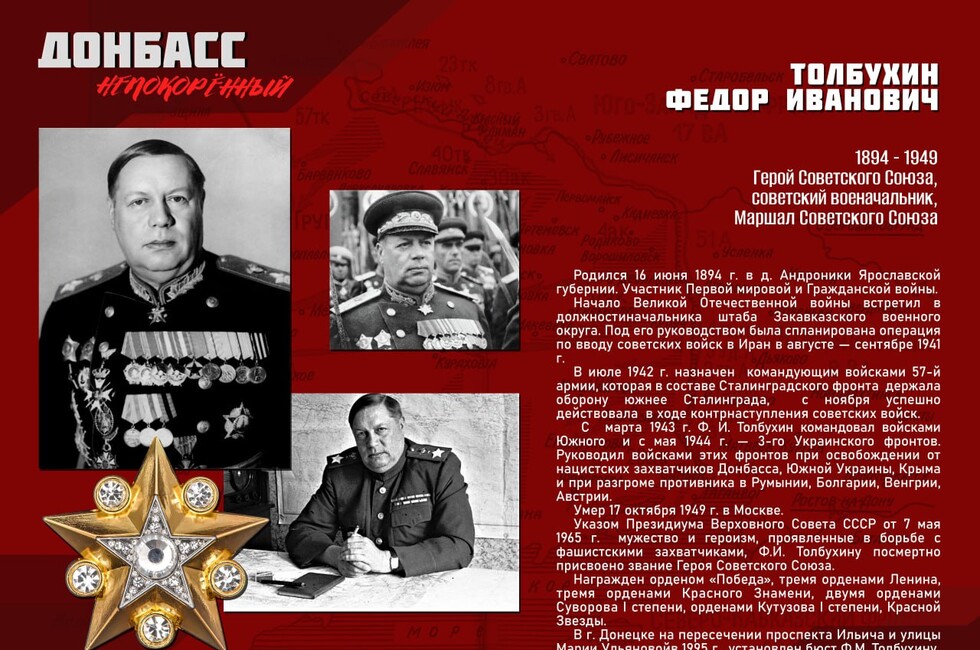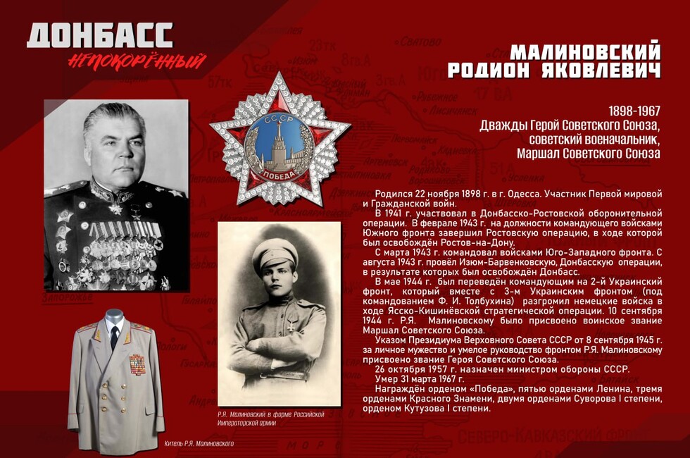 Героями экспозиции стали видные военачальники, в их числе дважды Герой СССР маршал Родион Малиновский, Герой СССР маршал Федор Толбухин, Герой СССР генерал полковник Вячеслав Цветаев, член Военного совета Южного фронта генерал-лейтенант Кузьма Гуров, командир 32-й отдельной танковой бригады полковник Франц Гринкевич и другие. Все они так или иначе связаны с освобождением региона от нацистских захватчиков. На планшетах биографии военачальников, их фото и другие ценные артефакты.