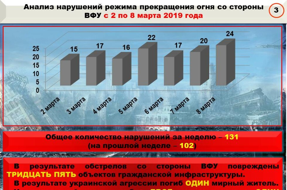 За предыдущую неделю, как сообщалось 1 марта, украинская армия 102 раза нарушила режим тишины, в результате обстрелов было повреждено 17 домостроений в ДНР. *ха*сж*нк