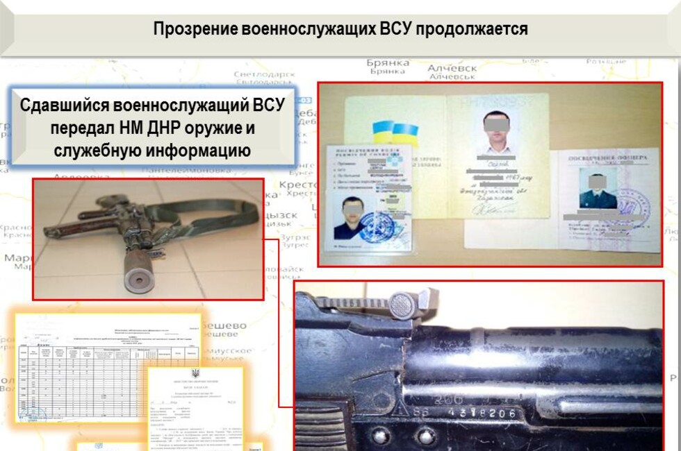«Как сообщалось ранее, на нашу сторону перешел военнослужащий ВСУ Сергей Т.. Мы не раскрываем его личности и места прохождения службы по причине того, что у Сергея в Украине остались родственники и он опасается за их безопасность. Сегодня мы можем показать только часть его личных документов, а также его личное оружие и электронные версии некоторых служебных документов, которые он заблаговременно скопировал в штабе соединения», – сказал заместитель командующего.
