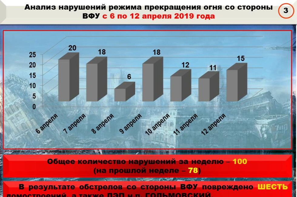«За прошедшую неделю зафиксировано 100 обстрелов по районам 20 населенных пунктов Республики с применением минометов калибрами 120 и 82 мм, вооружения БМП, гранатометов, крупнокалиберных пулеметов и стрелкового оружия», - отметил он.