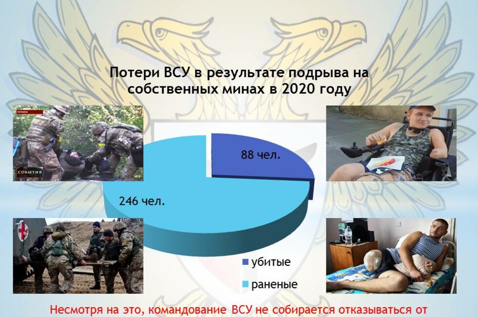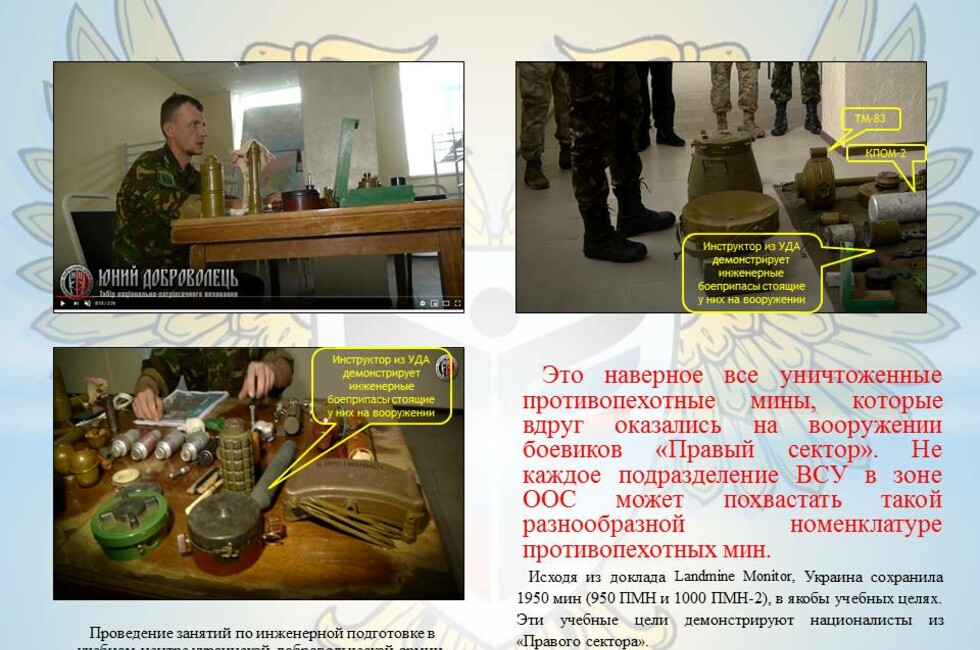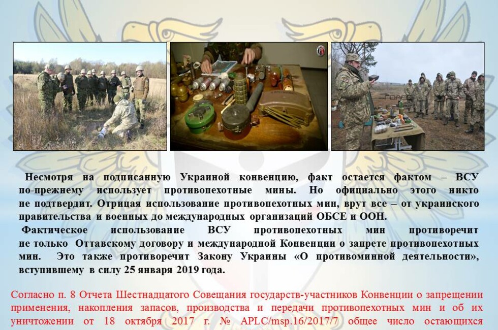 В 2017 году, акцентировал внимание замначальника УНМ, в распоряжении республиканской разведки попал документ, прямо доказывающий применение украинскими войсками запрещенных взрывных устройств. В нем значится оборудование 356 минных полей. Четырьмя бригадами ВСУ (из 12, дислоцированных в Донбассе), по сведениям из документа, установлено 21 418 противотанковых и 1028 противопехотных мин.