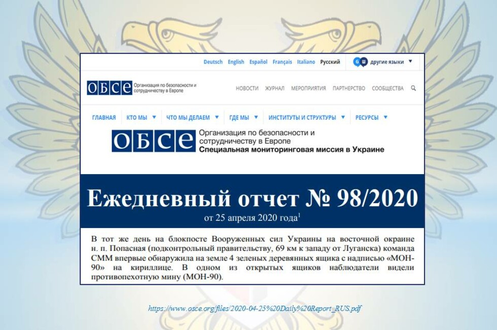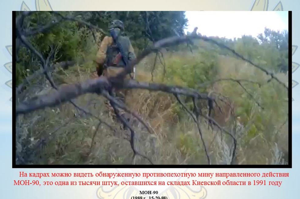 Басурин отметил в этой связи, что силами ДНР неоднократно обнаруживались в лесополосах вблизи населенных пунктов, ранее находящихся под контролем украинских вооруженных формирований, устройств типа МОН-90. Это противопехотная осколочная мина направленного поражения. Предназначена для выведения из строя личного состава противника. При детонации наносит человеку урон убойными элементами (шариками или роликами), вылетающими на расстояние до 90-99 метров.