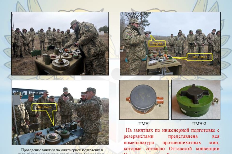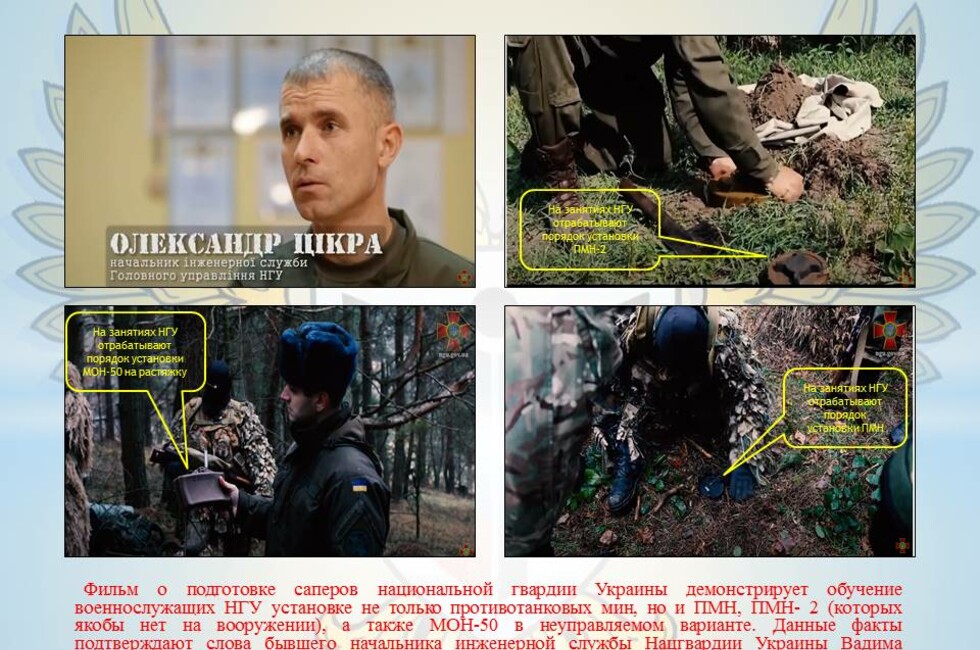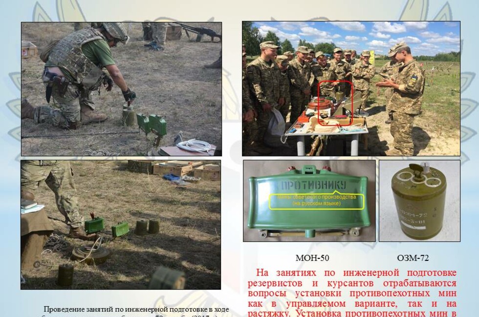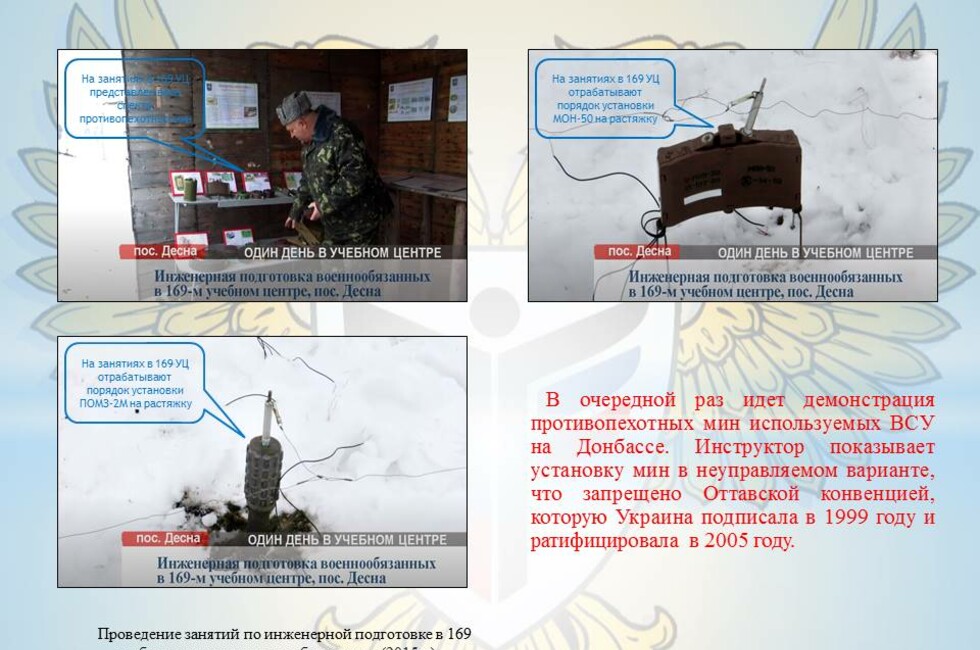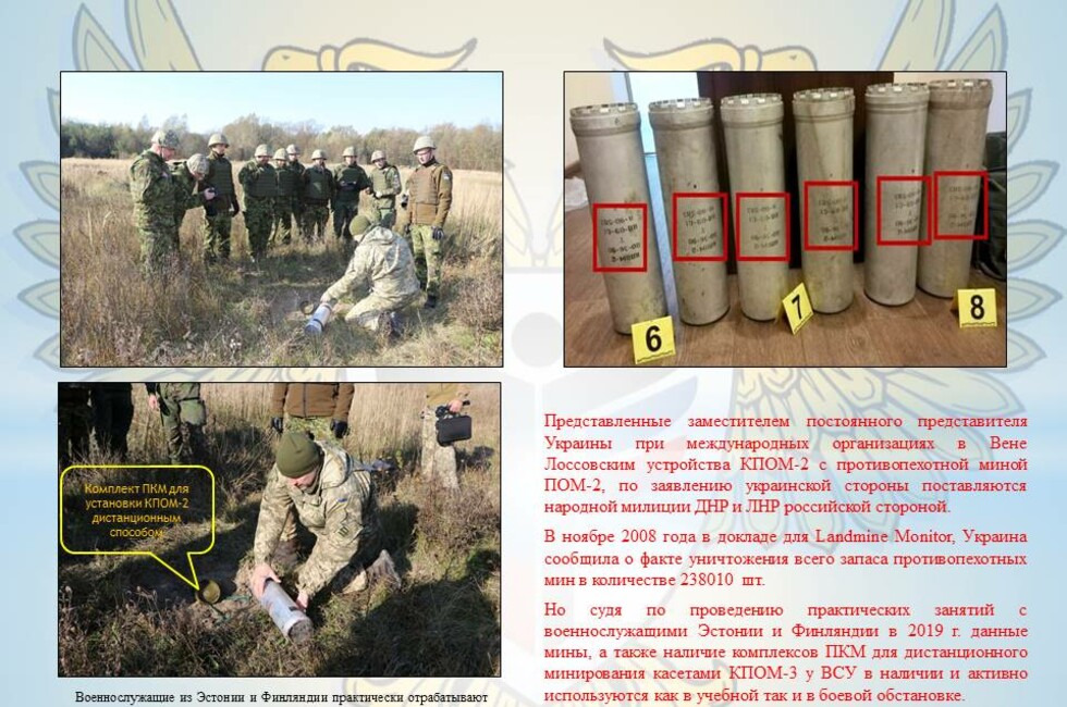Басурин напомнил, что в ноябре 2008 года Киев отчитался о ликвидации 238 010 противопехотных мин. Но, продолжил он, судя по регулярным учениям украинских войск, мины и комплексы дистанционного минирования в наличии и используются в учебной и боевой обстановке. В учебных центрах военные ВСУ проходят курс подготовки по обращению с противопехотными минами, применяемыми в Донбассе, а в открытых источниках демонстрируется подготовка боевиков-радикалов к диверсиям с использованием мин направленного и нажимного действия.