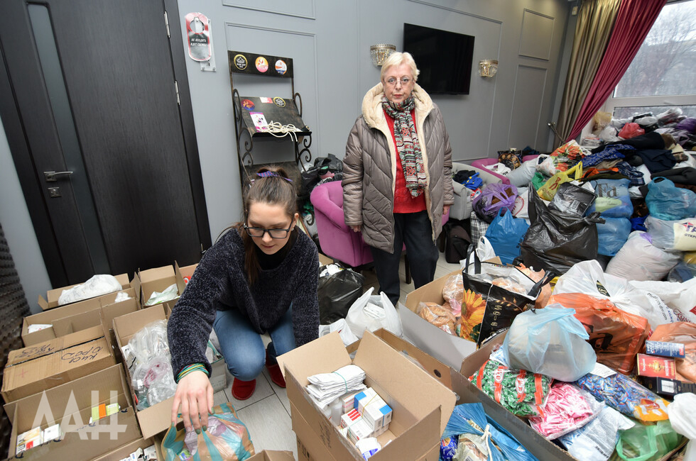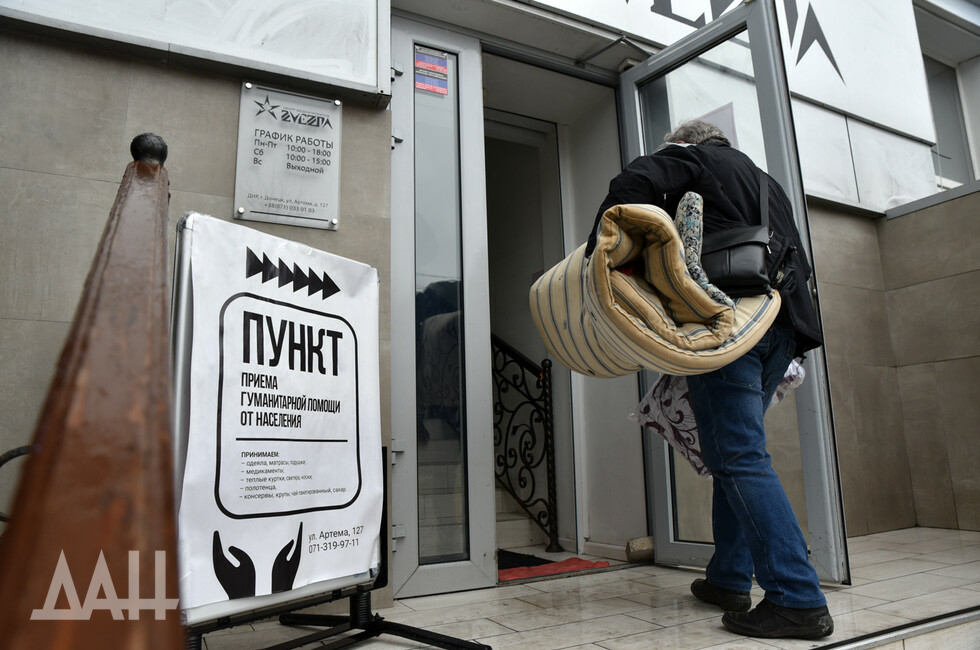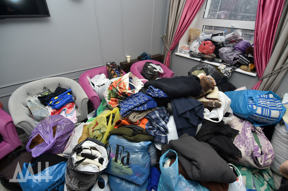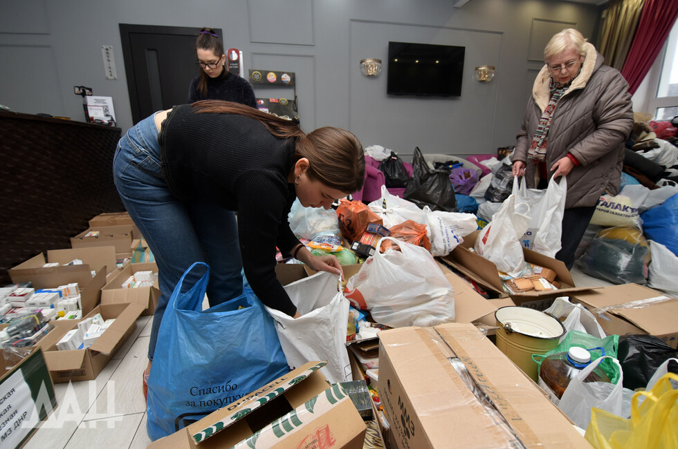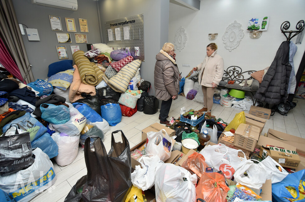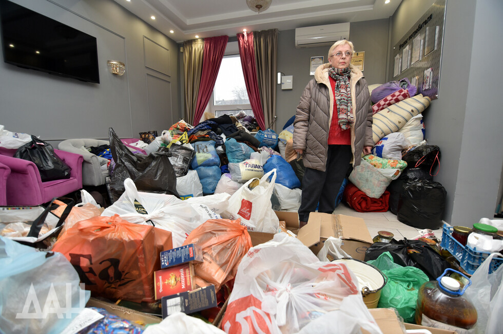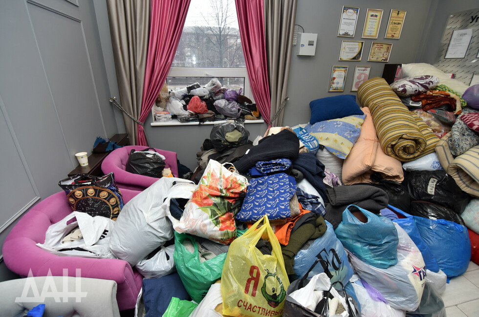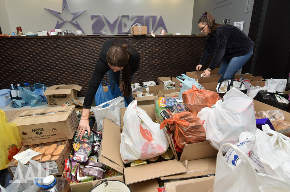 Помещение Центра медиапроектов «Звезда» напоминает склад, буквально заваленный продуктами, вещами, и лекарствами, которые приносят неравнодушные жители шахтерской столицы. Повсюду – коробки, свертки, тюки. Люди приносят все, что только могут, например, пожилой мужчина пожертвовал полмешка картошки – как говорится, от души! Молодые девушки принимают гуманитарный груз от населения, сортируют его и готовят к отправке на фронт.