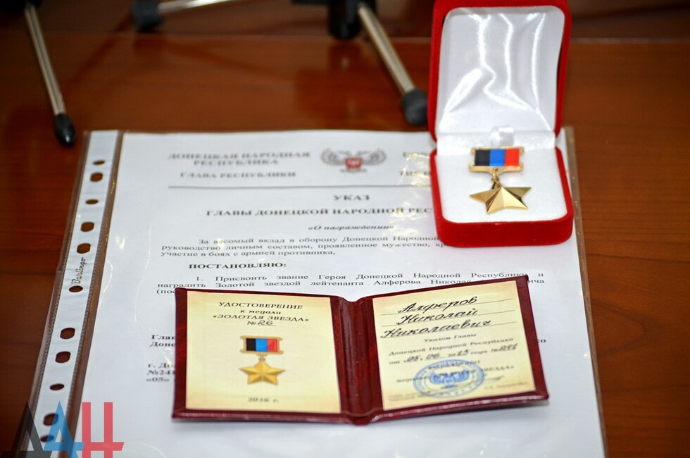 За весомый вклад в оборону ДНР, умелое руководство личным составом, проявленное мужество, храбрость и активное участие в боях с армией противника, Глава Республики наградил высшей наградой государства лейтенанта Романа Ныркова (1977 — 2015), майора Константина Костенко (1980 — 2015), лейтенанта Николая Алферова (1963 — 2015).