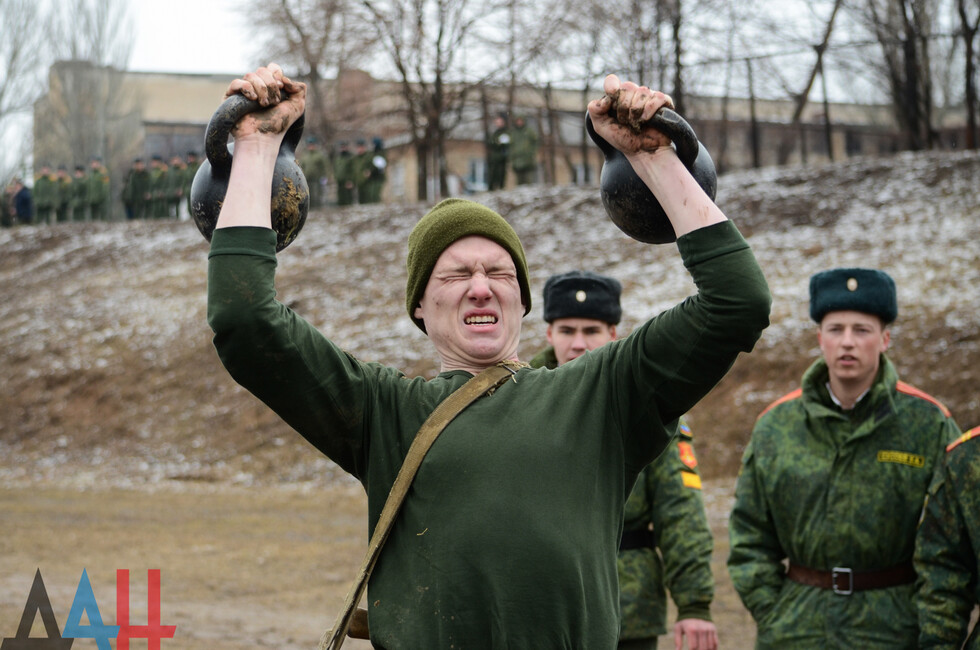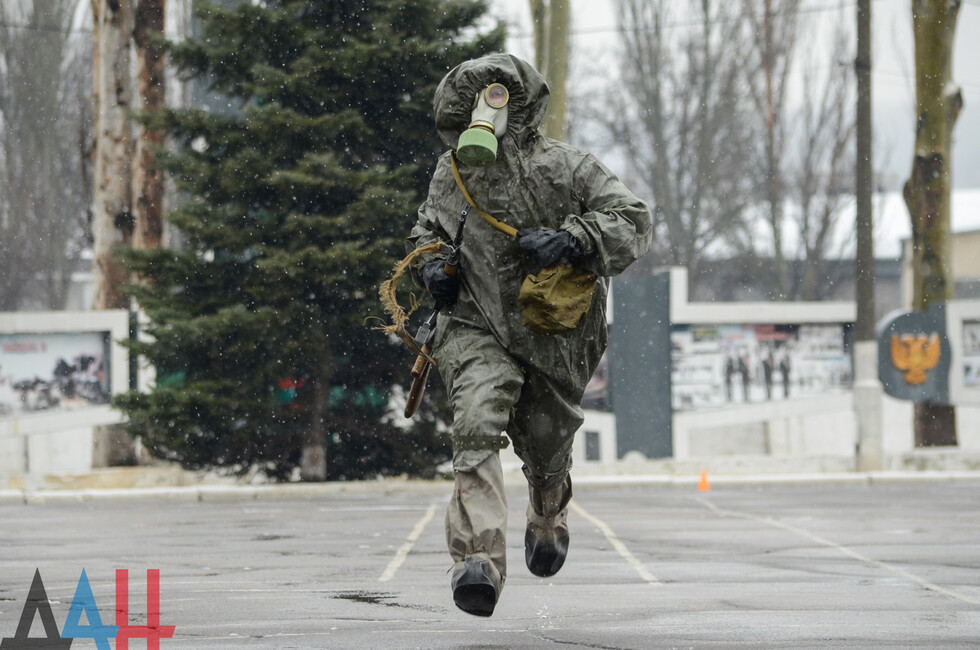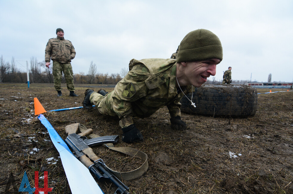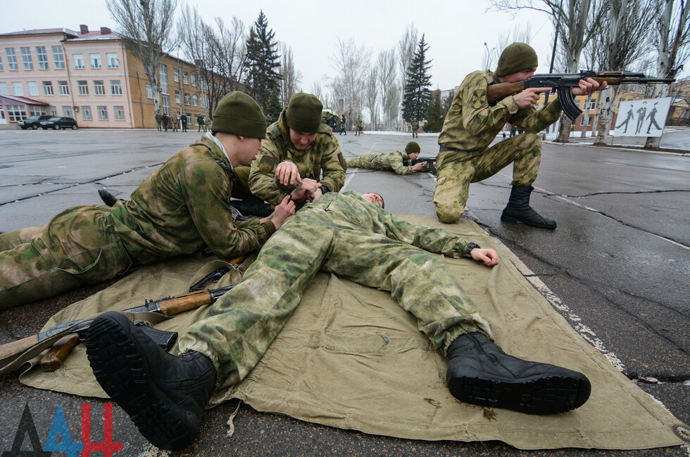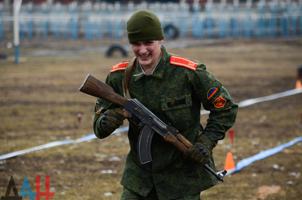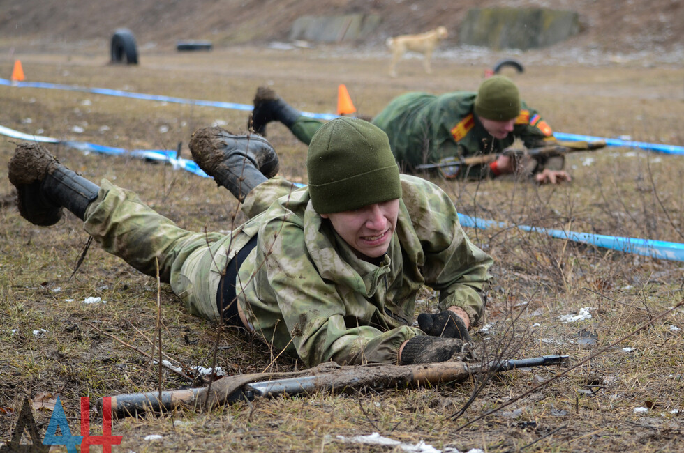 Мероприятия проходят на базе ДонВОКУ. Сегодня там участвовало две команды по 12 человек. Курсанты выполняли различные нормативы. В частности, на время надевали костюмы химической защиты, условно эвакуировали раненых товарищей с поля боя, оказывали им первую помощь, соревновались в сборке и разборке оружия (пулеметов, автоматов, винтовок), метали ножи и гранаты.