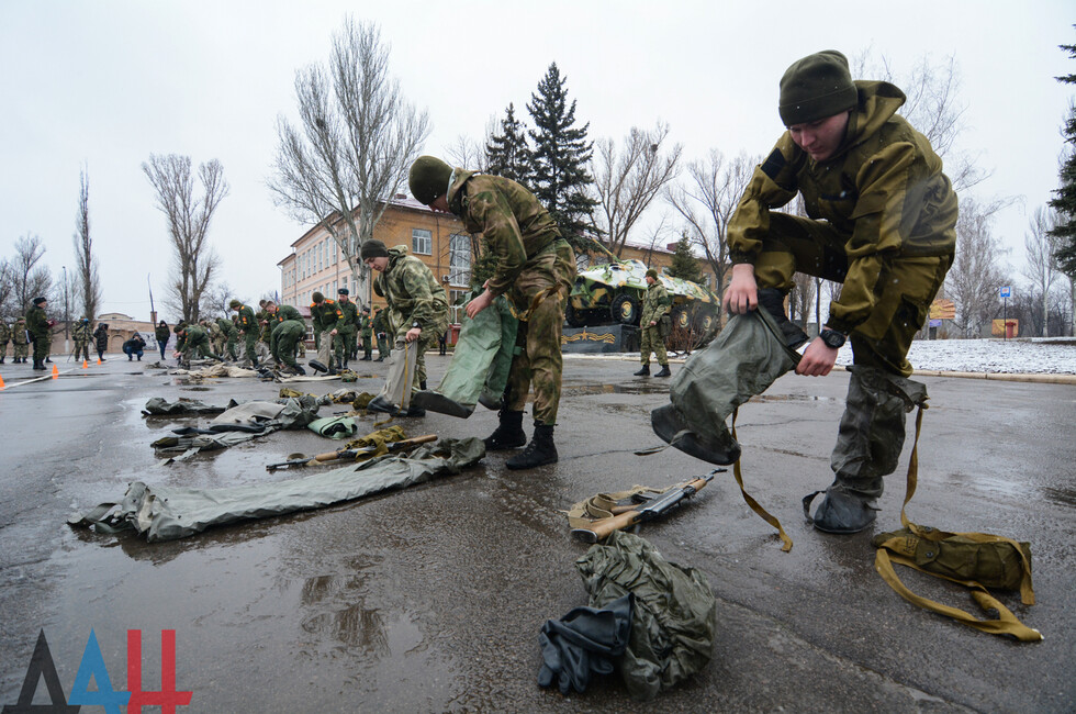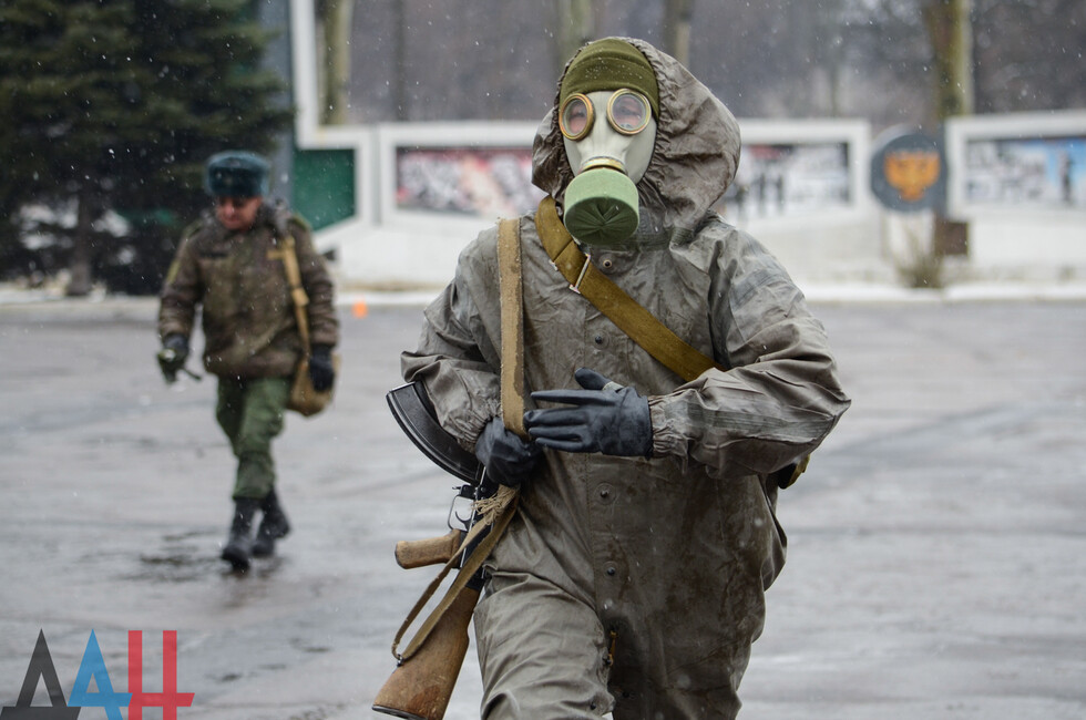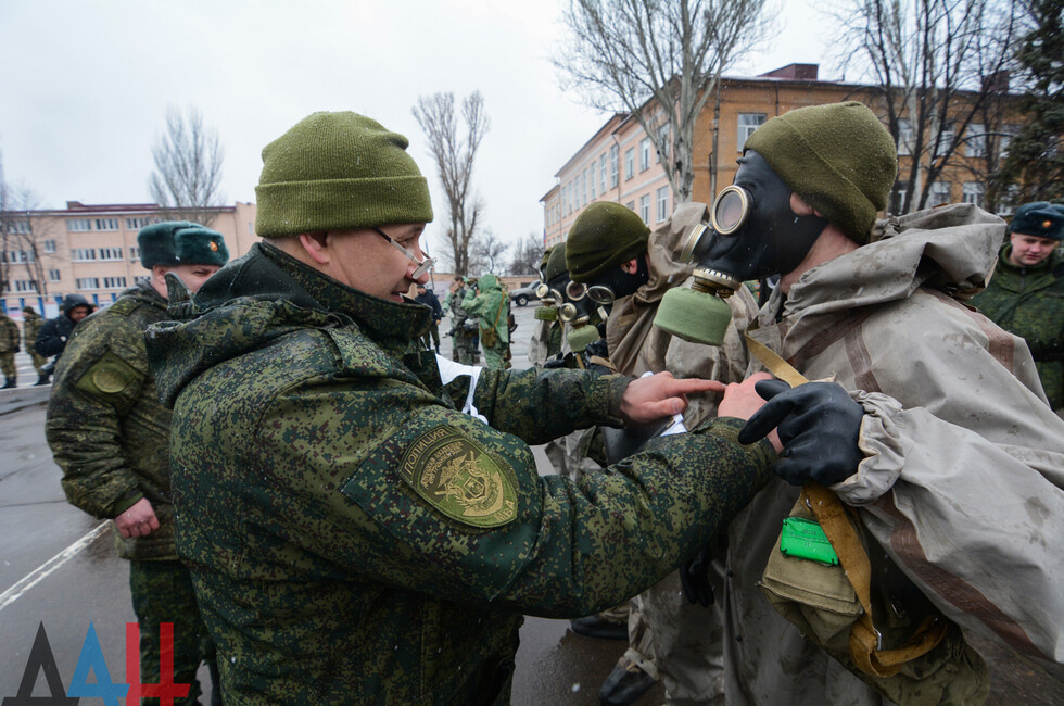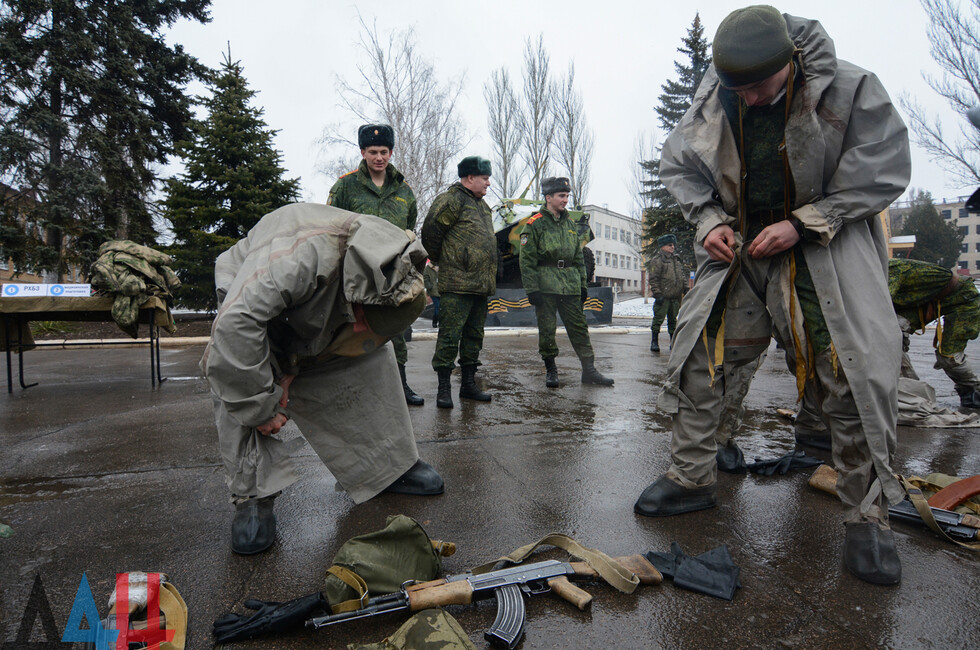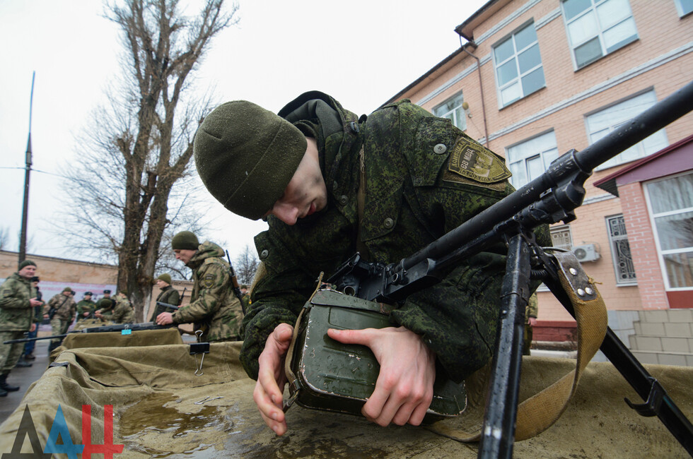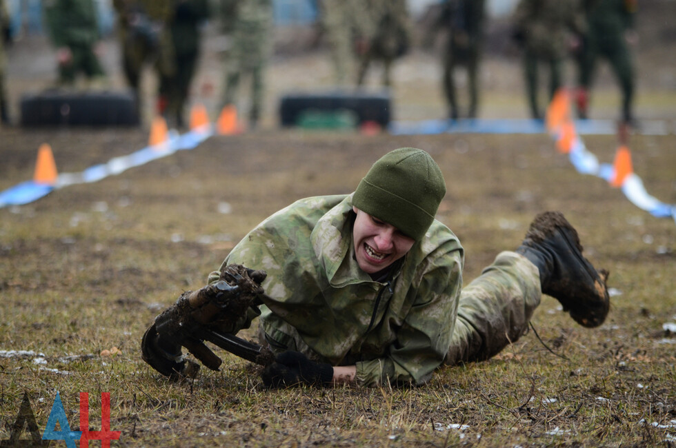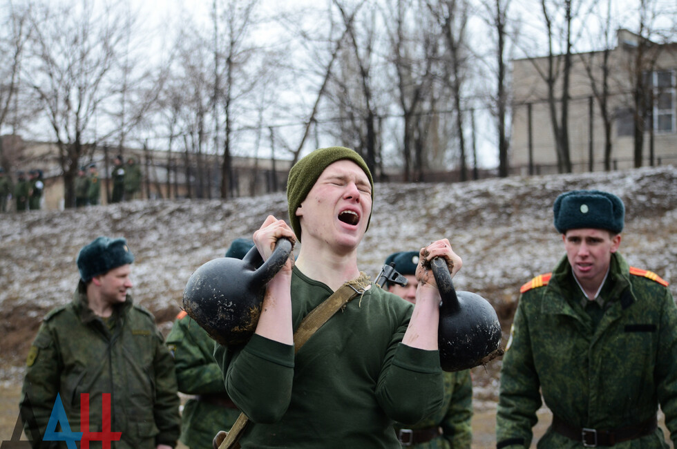 Мероприятия проходят на базе ДонВОКУ. Сегодня там участвовало две команды по 12 человек. Курсанты выполняли различные нормативы. В частности, на время надевали костюмы химической защиты, условно эвакуировали раненых товарищей с поля боя, оказывали им первую помощь, соревновались в сборке и разборке оружия (пулеметов, автоматов, винтовок), метали ножи и гранаты.
