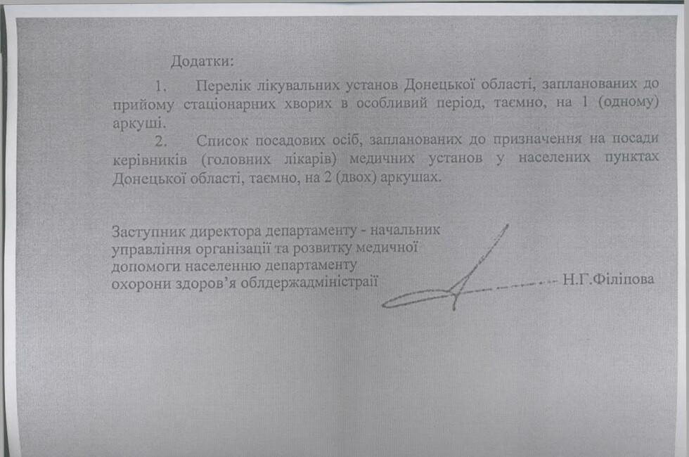 В качестве доказательства своих слов, Басурин предоставил секретное письмо на имя командующего ООС Сергея Наева от начальника управления организации и развития медицинской помощи населению департамента здравоохранения Донецкой облггосадминистрации Натальи Филипповой. Документ был добыт разведкой Народной милиции ДНР.