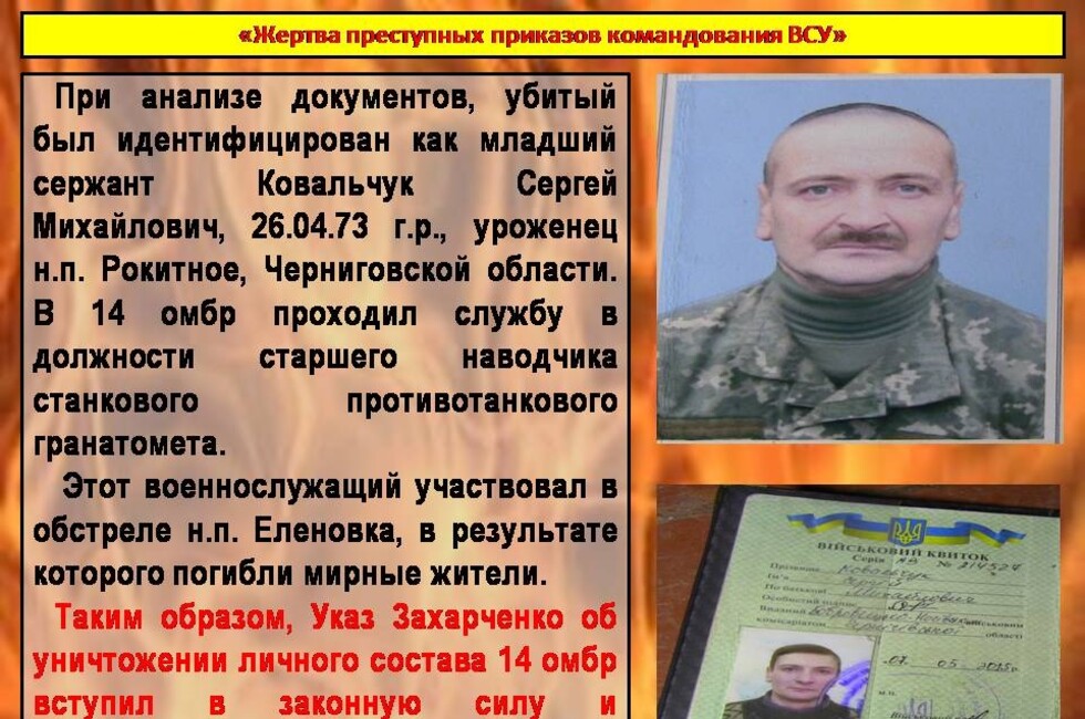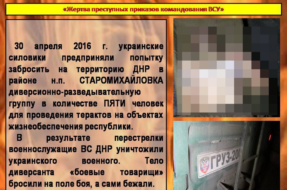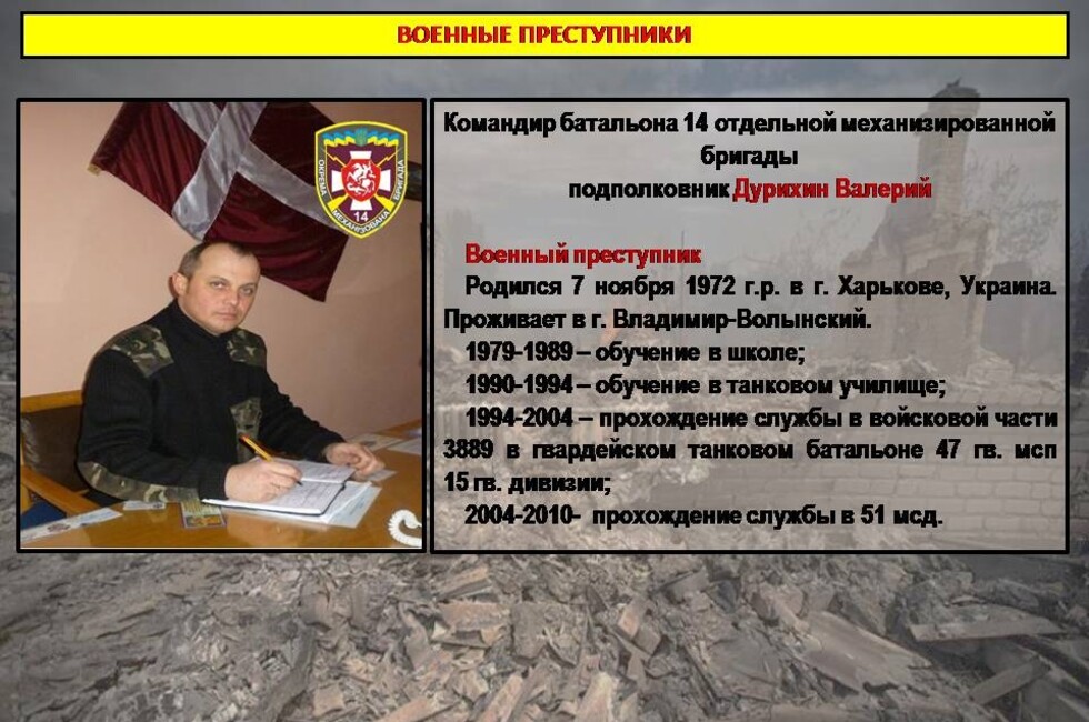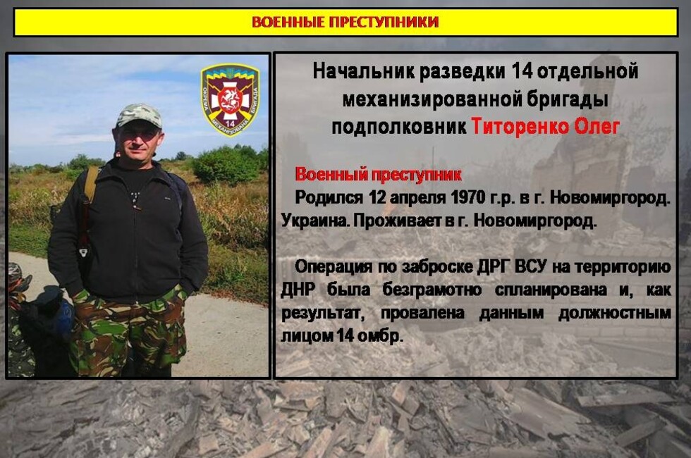Материал включает данные о командире батальона 14-й отдельной механизированной бригады подполковнике Валерии Дурихине и начальнике разведки той же омбр подполковнике Олеге Титоренко. Согласно данным Минобороны, под руководством этих офицеров 30 апреля была проведена неудачная операция по переброске диверсионно-разведывательной группы через линию соприкосновения в районе поселка Старомихайловка.