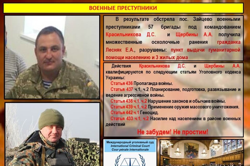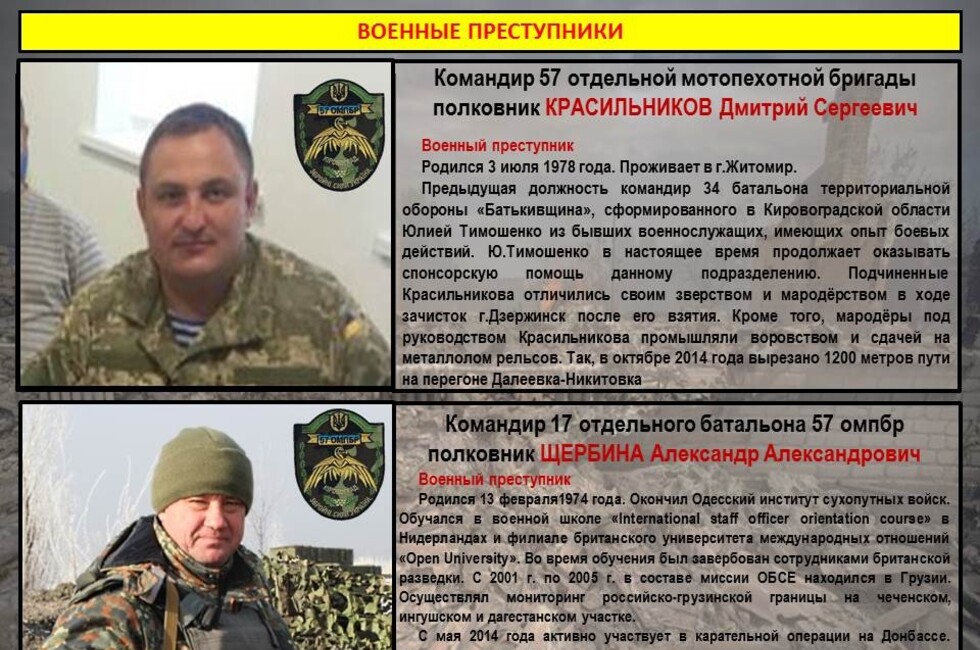 По данным Минобороны, обстрелы жилых кварталов под Горловкой производились по приказам включенных в перечень командиров 17 отдельного батальона 57 омбр полковника Александра Щербины и командира отдельной 57 омбр полковника Дмитрия Красильникова.