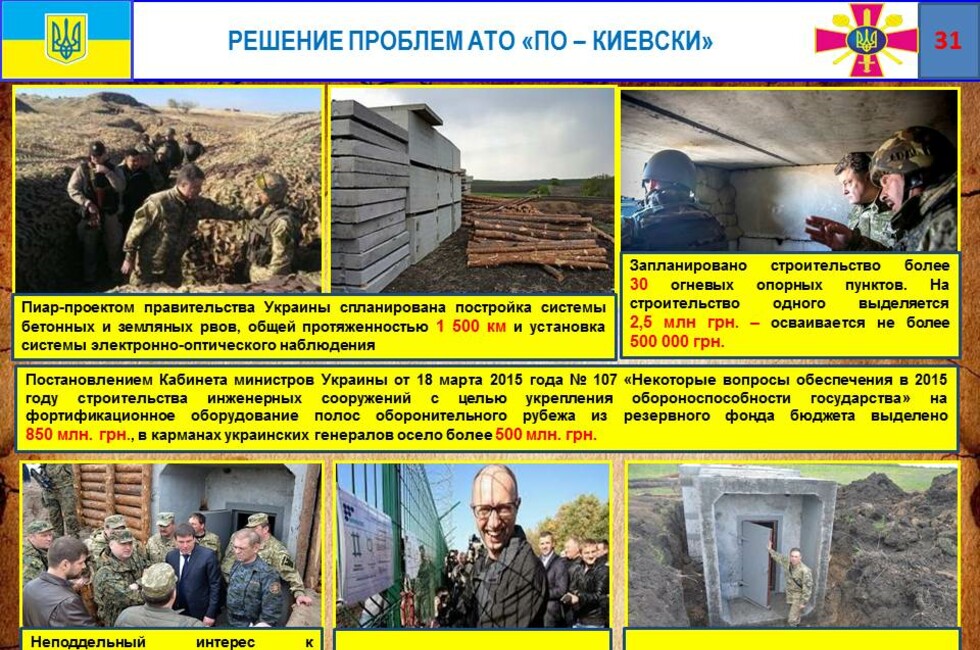 При этом военные и гражданские руководители киевского режима упорно замалчивали и пытались отрицать реальный масштаб потерь, так как для многих из них операция на Донбассе стала источником больших коррупционных доходов. К примеру, только на фортификационные сооружения с марта 2015 года Киевом было потрачено около 850 млн гривен из резервного фонда страны, примерно 500 млн гривен из этой суммы присвоены высшим командованием ВСУ.