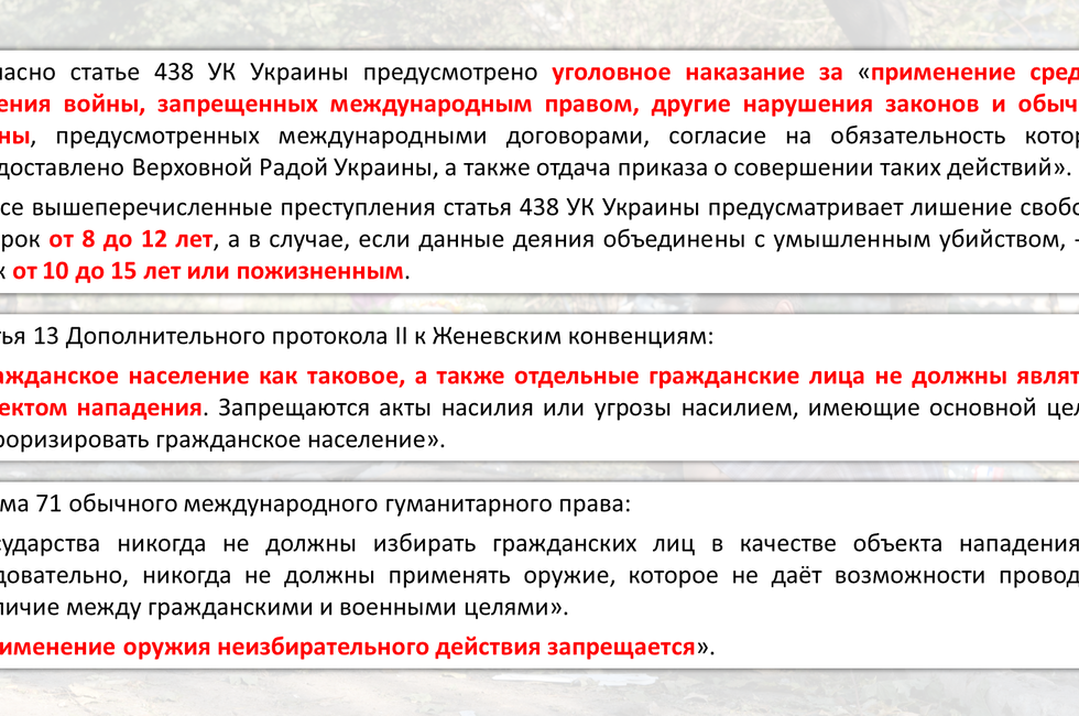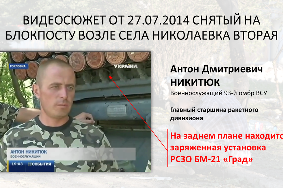 «Нам известно, что 21 июля подразделения ВСУ захватили Дзержинск, затем с его направления – Майорск; 24 июля батальон «Артемовск» контролировал Майорский блокпост; 25 июля данный батальон захватил северную часть Зайцево. Таким образом, весь сектор из которого производился обстрел, находился под контролем украинских вооруженных формирований, - отметил Копыл. - Что же касается подразделений, находившихся 27 июля 2014 года в рассматриваемом нами секторе, то это был батальон «Артемовск», а также 93-я отдельная механизированная бригада, именно на вооружении последней состояли РСЗО БМ-21 «Град»».