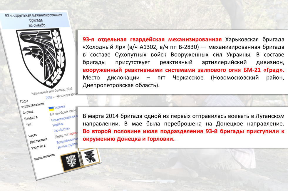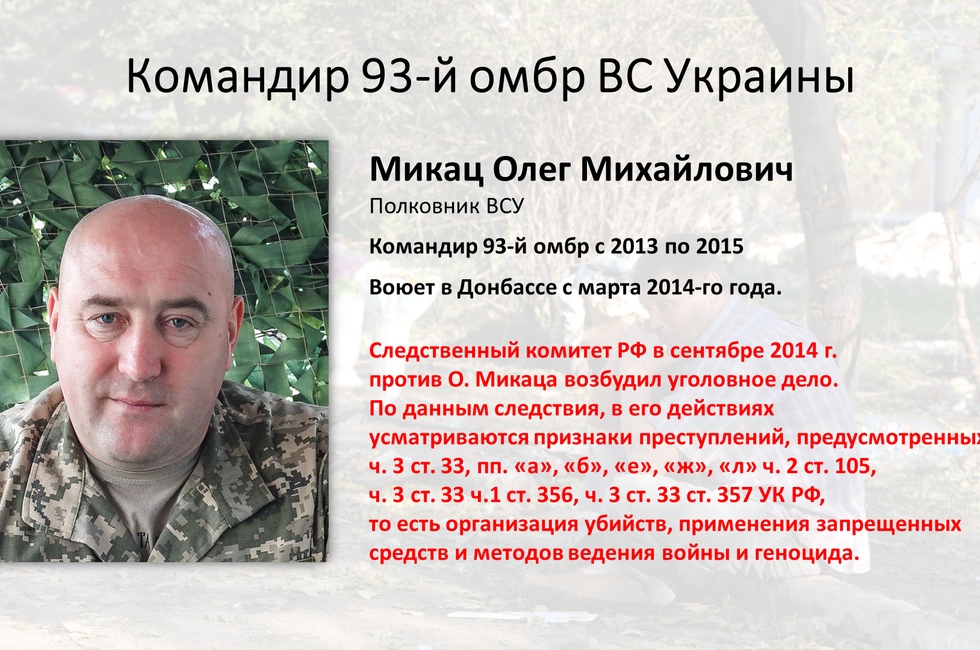 По его словам, 93-я механизированная бригада ВСУ является одной из наиболее задействованных в ходе боев в Донбассе украинских частей, которая в июле 2014 года приступила к операции по окружению Донецка и Горловки. «В 2014 году бригадой командовал полковник ВСУ Олег Микац, который поддерживает взгляды украинских националистов», - добавил представитель организации.