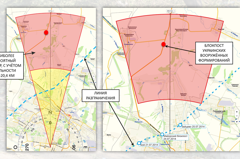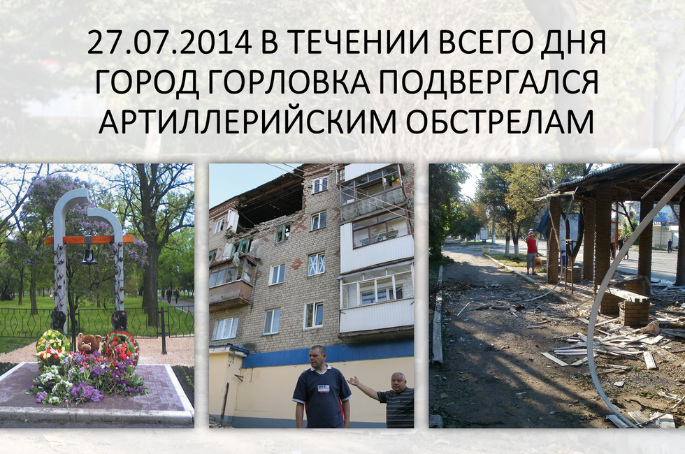 «Рядом со всеми местами попадания были обнаружен фрагменты снарядов, явно указывающие на применение РСЗО БМ-21 «Град». В соответствии с тактико-техническими характеристиками осколочно-фугасных снарядов, используемых для стрельбы из РСЗО БМ-21 «Град», наиболее вероятной дальностью, с которой был произведен артиллерийский обстрел центра города Горловки 27 июля 2014 года в 12:30 является от 12 до 20,4 км. Нанеся на карту направление обстрела и учтя погрешность 15 градусов, а также наиболее вероятную дальность, мы получили сектор из которого был произведен обстрел», - сказал Копыл.