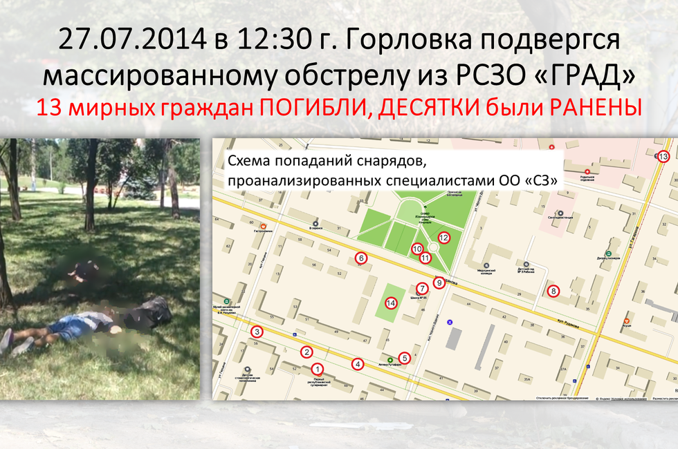 Он добавил, что удалось установить 14 мест попадания снарядов в центре Горловки. Изучив и проанализировав все пригодные к анализу воронки, специалисты ОО «СЗ» пришли к выводу, что обстрел был произведен с севера на юг со стороны украинских позиций.