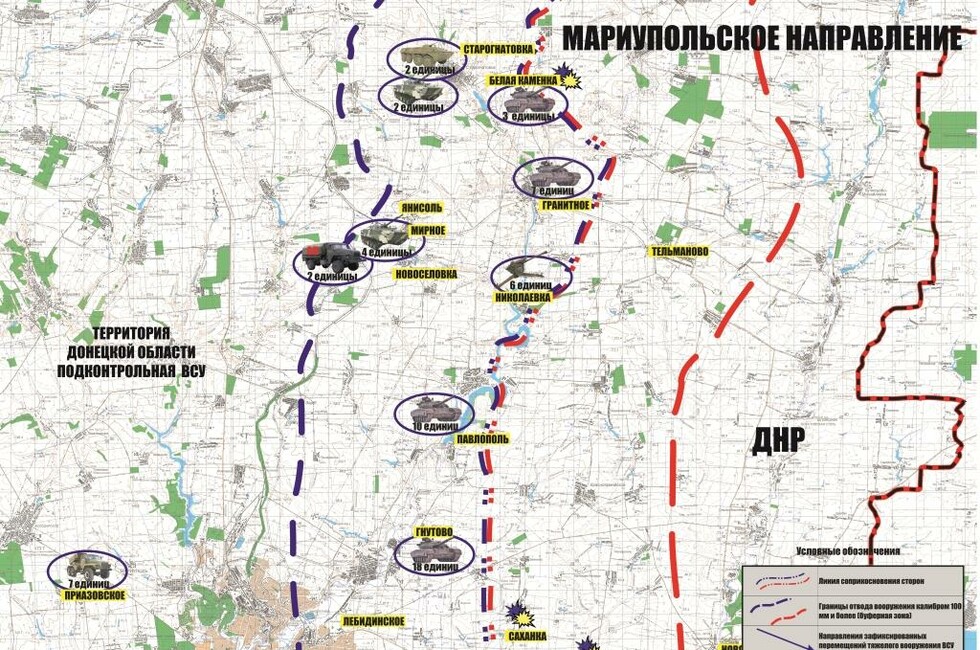 От отметил, что по данным разведки ДНР, украинские военные за прошедшую неделю подтянули к линии разграничения в различных населенных пунктах на Горловском, Мариупольском и Донецком направлениях 111 единиц артиллерии (в том числе САУ, БМ-21 «Град», Д-30), 166 танков, 147 единиц БМП и БТР, 26 автомобилей с боеприпасами и более 660 человек личного состава, в том числе и членов украинской экстремистской организации «Правый сектор».
