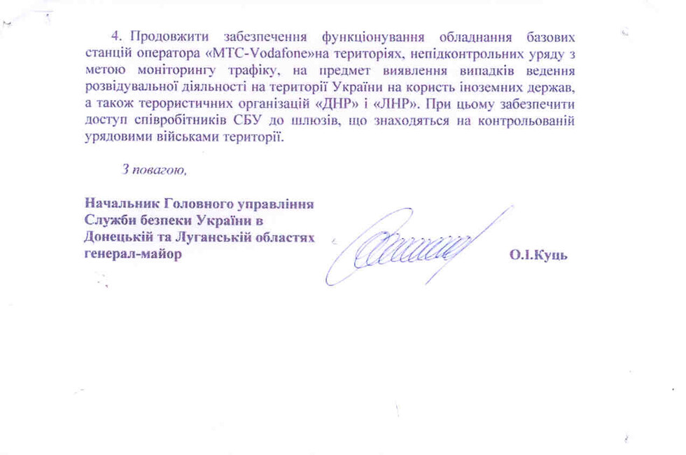 При этом в СБУ не намерены отключать связь «МТС-Водафон» на территориях ДНР и ЛНР, чтобы оставить возможность для мониторинга действий Донецка и Луганска. В этой связи «предлагается обеспечить доступ сотрудникам СБУ к шлюзам, которые находятся на контролируемой правительственными войсками территории», предлагает Куц. *ъъ*сж