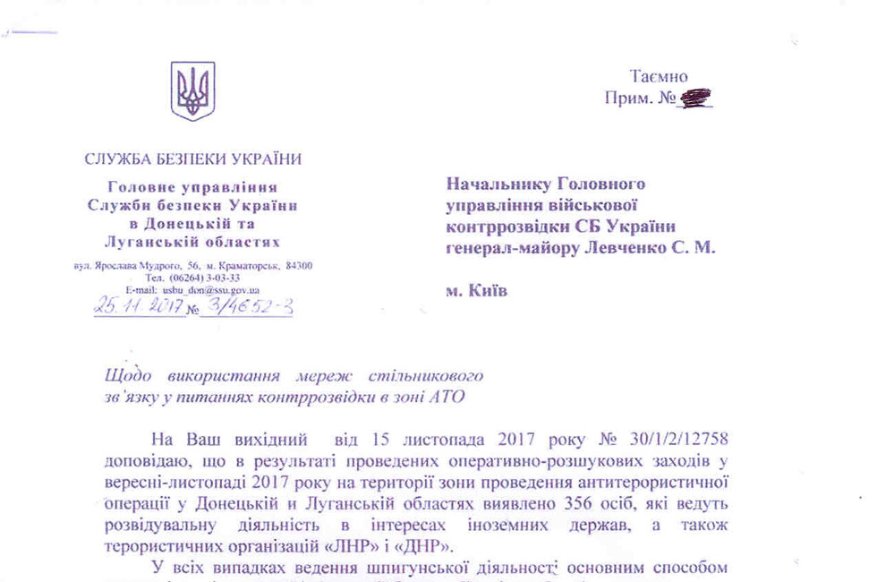 «Предлагаю запретить использование средств мобильной связи в 50-ти км зоне вдоль линии соприкосновения путем полного отключения базовых станций всех сотовых операторов в указанной зоне», – пишет Куц Левченко в донесении (документу присвоен гриф «секретно»).