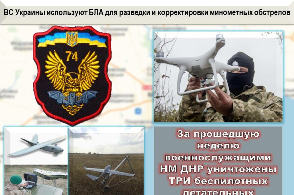 Согласно пункту 7 Минского меморандума от 19 сентября 2014 года, использование боевой авиации и БПЛА запрещено вдоль линии соприкосновения сторон в зоне прекращения применения оружия на ширину не менее 30 км, за исключением беспилотных летательных аппаратов Специальной мониторинговой миссии ОБСЕ. Несмотря на это, ВСУ регулярно задействуют беспилотники, чаще всего с целью воздушной разведки местности и корректировки огня. *оя*мк