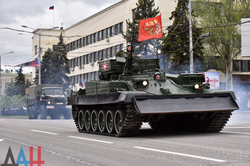 За пешими расчетами проследовала колонна военной техники. По сложившейся традиции парада в Донецке первым на главную улицу столицы выехал легендарный средний танк времен ВОВ - Т-34. Этот танк стоял в качестве монумента на Саур-Могиле, а в 2014-м оказался в эпицентре боев за легендарную высоту. В 2017 году он был отреставрирован и в том же году впервые принял участие в военном параде.