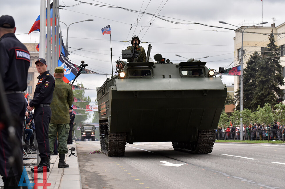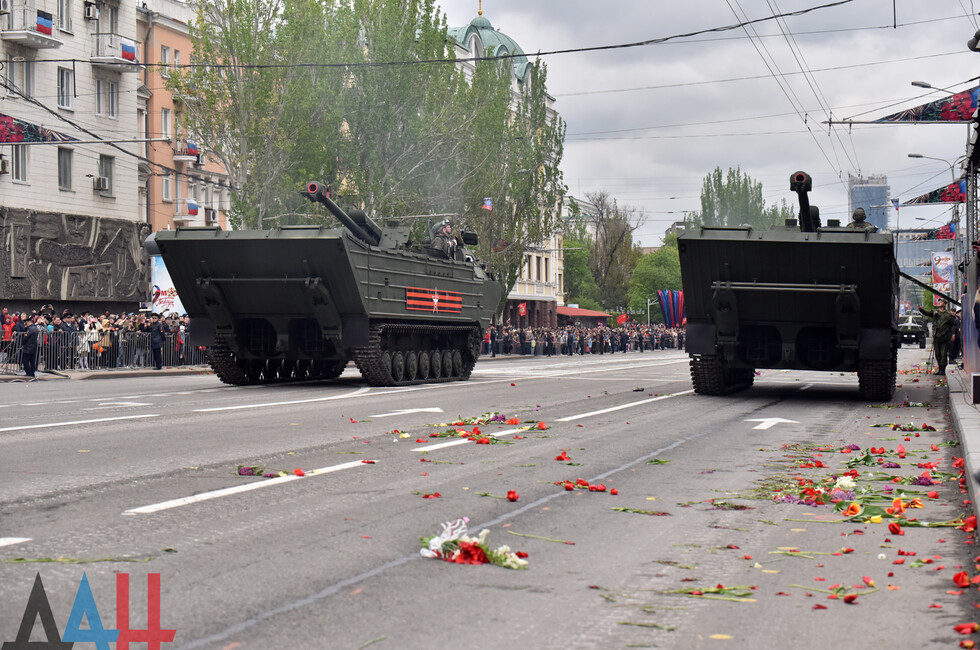 Затем прошли образцы современной техники, стоящей на вооружении Народной милиции ДНР. На улицу Артема выехал внедорожник УАЗ-3151 со знаменем сухопутных войск, далее проследовал БТР-80, квадроциклы, военные внедорожники с разными видами вооружения, боевые машины пехоты, танки Т-72 Б и Т-64. Далее проследовали реактивные системы залпового огня БМ-21 «Град», самоходные гаубицы «Гвоздика», буксируемая артиллерия – Д-30, «Мста-Б», минометы, противотанковые пушки «Рапира», зенитный ракетный комплексы «Стрела-10», зенитные скорострельные пушки ЗУ-23-2.