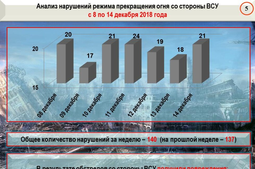 «Всего за неделю зафиксировано 140 фактов нарушения режима прекращения огня украинскими боевиками. По 22 населенным пунктам Республики противник выпустил 70 мин, из которых 39 мин – калибром 120 мм», - сказал Басурин.