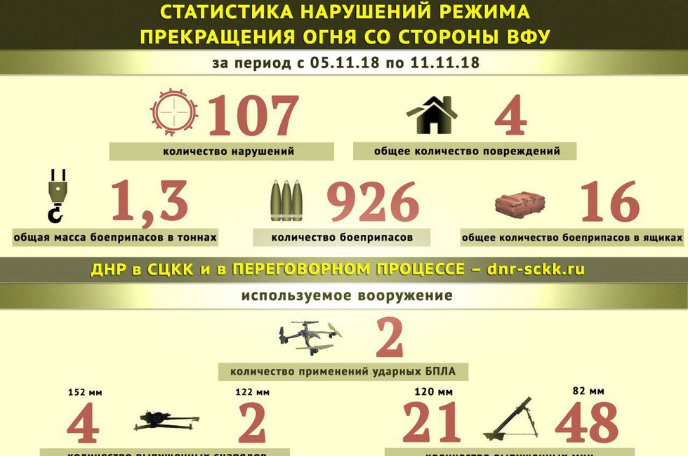 «С 5 по 11 ноября зафиксировано 107 нарушений режима прекращения огня со стороны ВСУ, - сказал он. - Общее количество примененных по территории ДНР боеприпасов – 926 или 1,3 тонны».