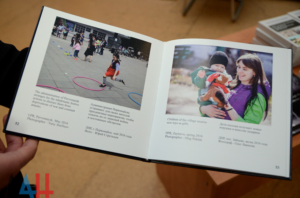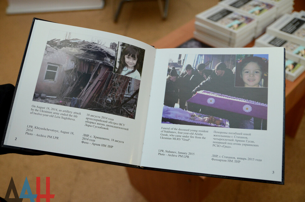 В свою очередь Айгистов представил тематический фотоальбом «Война глазами детей Донбасса». Иллюстрированное издание содержит пояснения на английском и русском языках. *оя*пг*дя