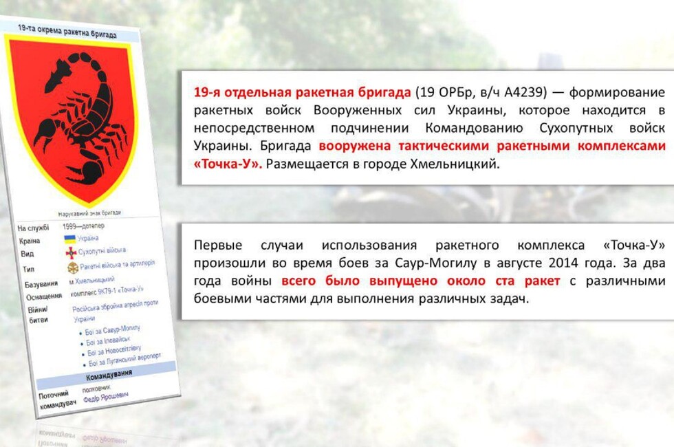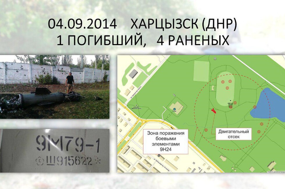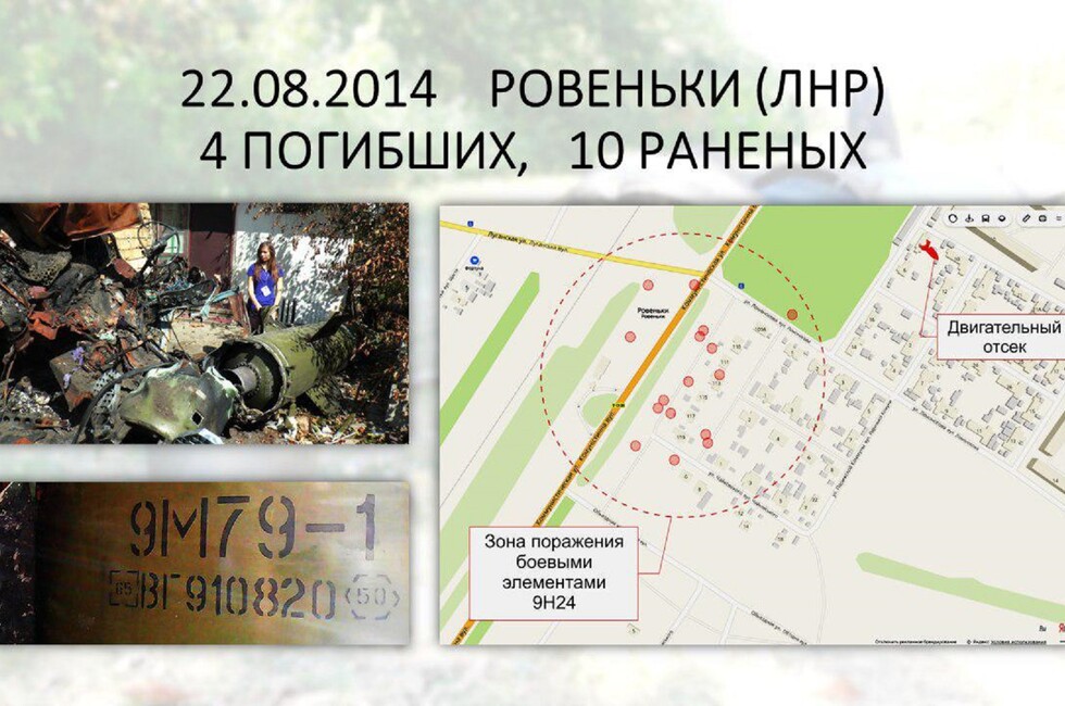 Согласно представленной на брифинге информации, 22 августа 2014 года был нанесен ракетный удар по Ровенькам в ЛНР. Под огонь попала юго-западная часть города. Погибли четыре мирных жителя. Второй случай использования ТРК «Точка-У» зафиксирован 4 сентября в Харцызске (ДНР). В зоне поражения оказались городской парк и стадион. В результате атаки один человек погиб, четверо получили ранения. Сообщается, что в обоих случаях найдены улики – фрагменты ракеты с маркировочными обозначениями.