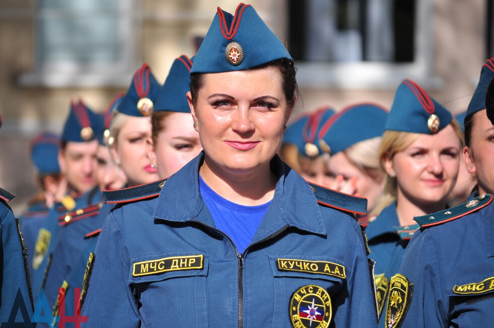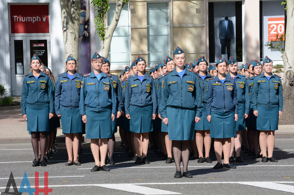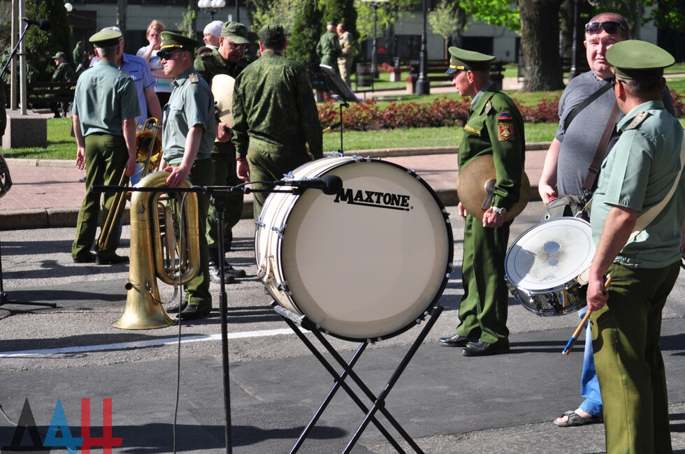 Под звуки духового оркестра на центральной улице состоялась также репетиция прохождения парадными коробками. В марше приняли участие военнослужащие различных подразделений Минобороны ДНР, сотрудники МЧС, МВД а также курсанты Донецкого высшего общевойскового командного училища.