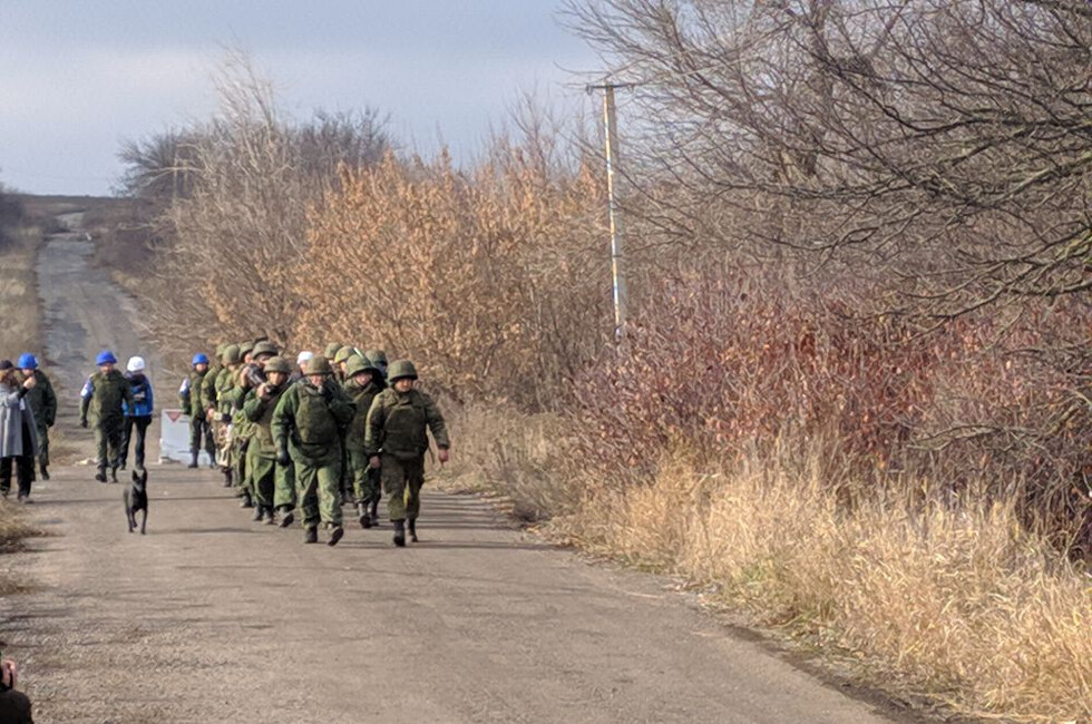 В настоящий момент военные общаются с сотрудниками СЦКК, а сотрудники ОБСЕ переписывают серийные номера их оружия. После этого военнослужащие НМ направятся к грузовику и покинут зону разведения.