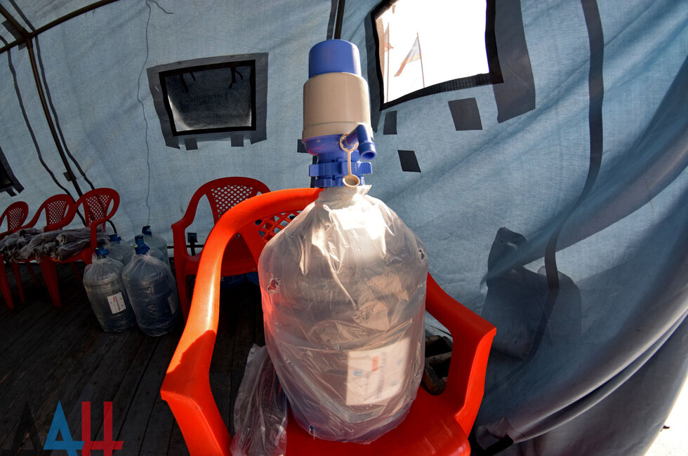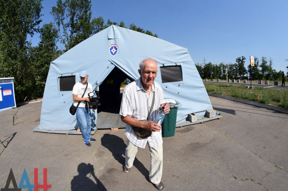 После депутат проверил палатки МЧС ДНР, установленные для оказания помощи гражданам, пересекающим линию фронта. Там можно выпить воды, померить давление и передохнуть от палящего солнца.