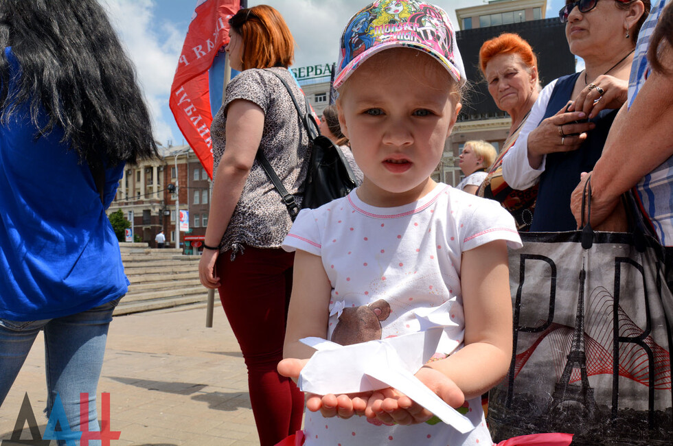 Донецк, 25 мая – корр. ДАН. Жители ДНР сегодня в преддверии четвертой годовщины первых боев за Донецк собрались на площади Ленина в центре столицы почтить память погибших горожан. Акцию «Донбасс за мир» поддержали около 10 тысяч человек.