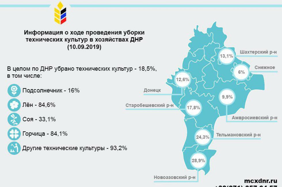 В Минагропроме также сообщили о ходе уборки технических культур. Подсолнечник убран на 16%, лен на 84,6%, соя – 33,1%, горчица – 84,1%. По состоянию на 10 сентября, в сборе урожая лидируют аграрии Новоазовского, Тельмановского и Старобешевского района. *мк*гж