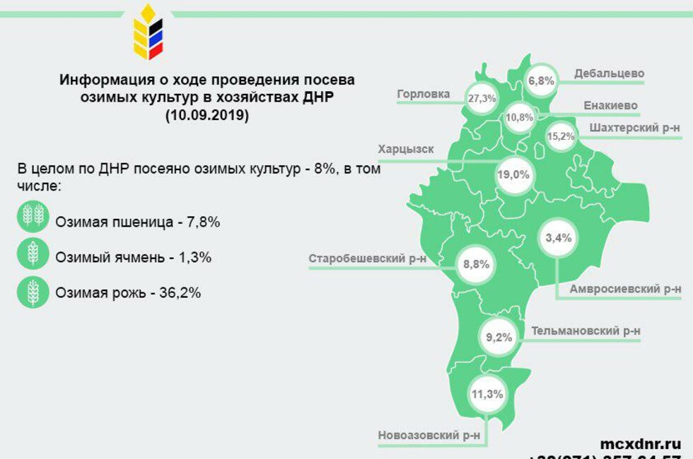 «Аграрии начали посевную кампанию озимых культур. В целом по ДНР посеяно 8% культур (от запланированного – прим. ДАН), в том числе 7,8% озимой пшеницы, 1,3% озимого ячменя, 36,2% озимой ржи», - отмечается в сообщении.
