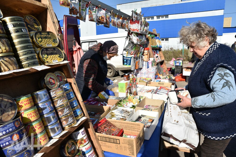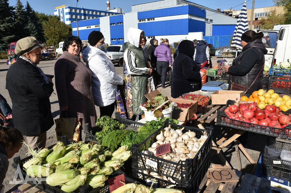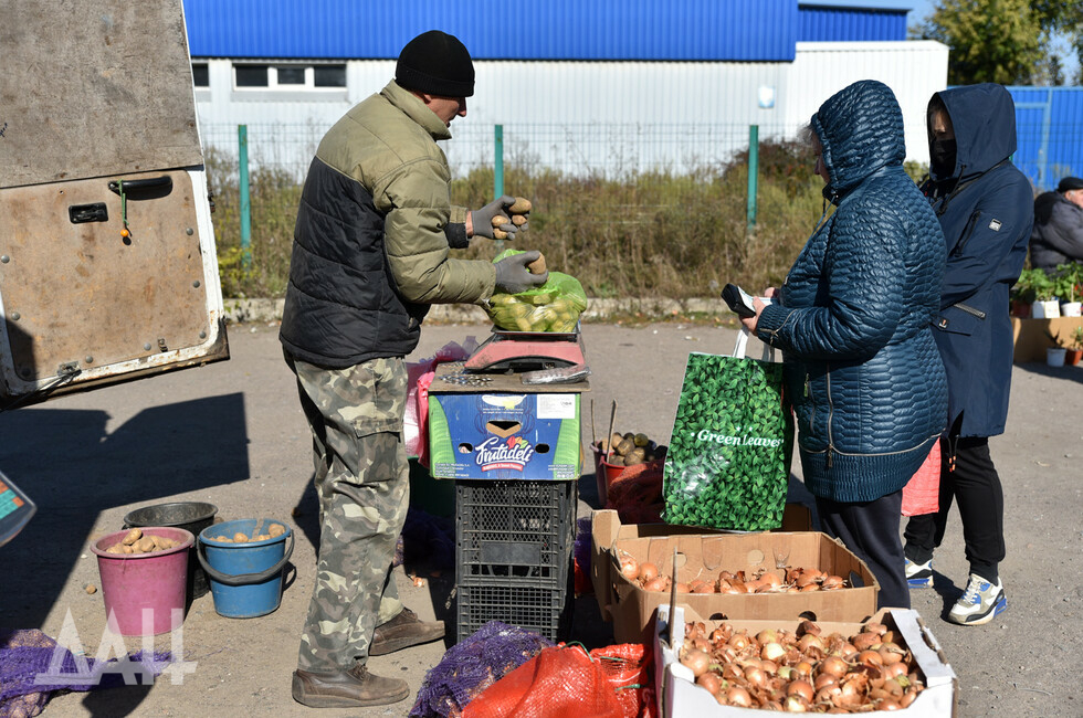 Торговля была организована у бывшего завода "Скиф" в Червоногвардейском районе Макеевки. Ярмарка небольшая – всего 5-7 палаток, преимущественно с овощами и фруктами. Также продавали консервы, специи, зелень. Картофель был местный и привозной, его цена в розницу в зависимости от размера и качества варьировалась от 38 до 55 руб./кг.