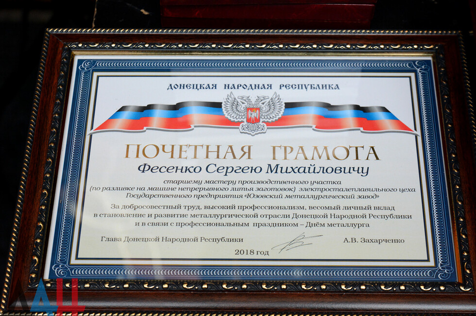 Также за добросовестный труд и профессионализм передовикам отрасли была вручена одна Почетная грамота Главы ДНР, шесть нагрудных знаков «Почетный работник металлургии», 52 ведомственные награды и грамоты и один почетный знак Федерации профсоюзов.