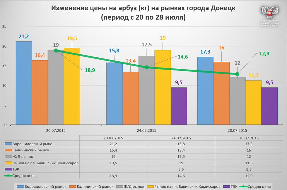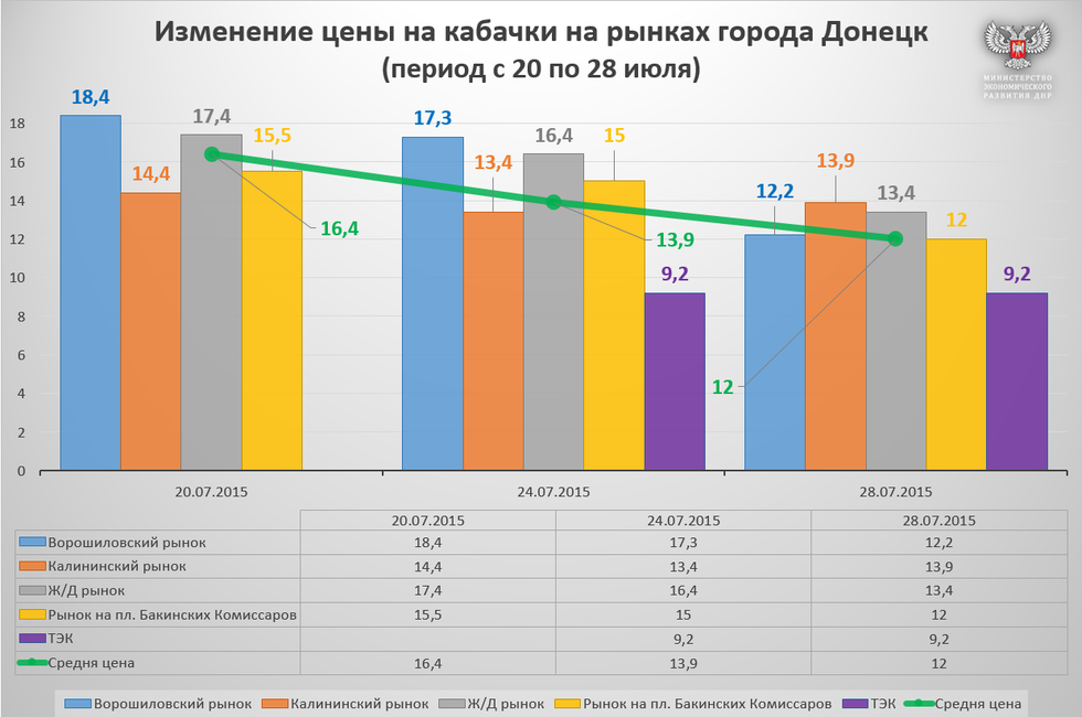 «В частности, цена кабачков на Ворошиловском рынке составляла 18 гривен 40 копеек, сейчас же стоимость овощей снизилась до 9 гривен 20 копеек. Остальные овощи упали в цене на 12 гривен, это практически 50 процентов», - подчеркнула глава экономического ведомства.