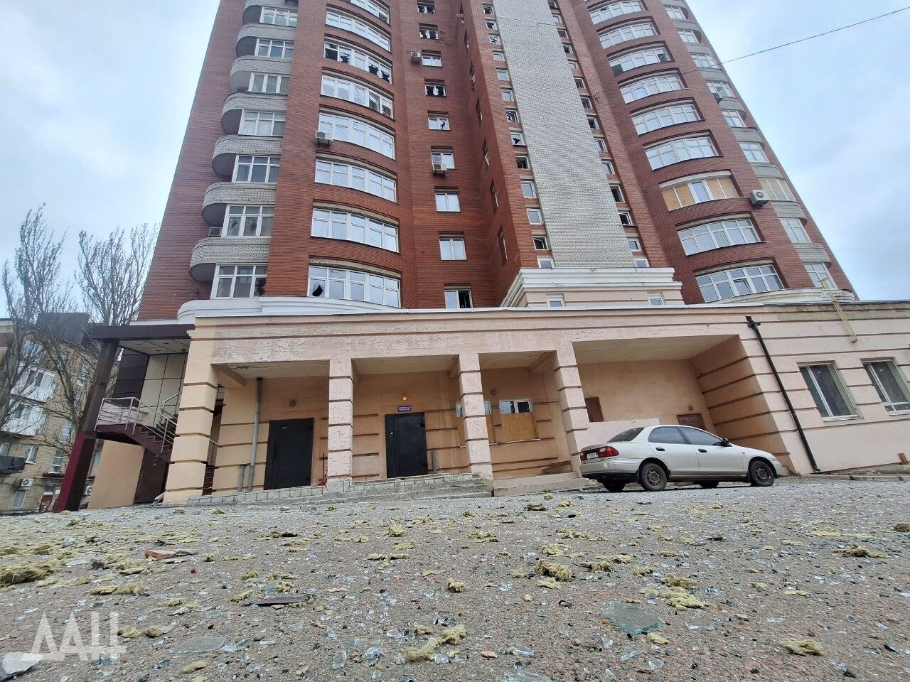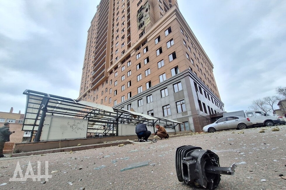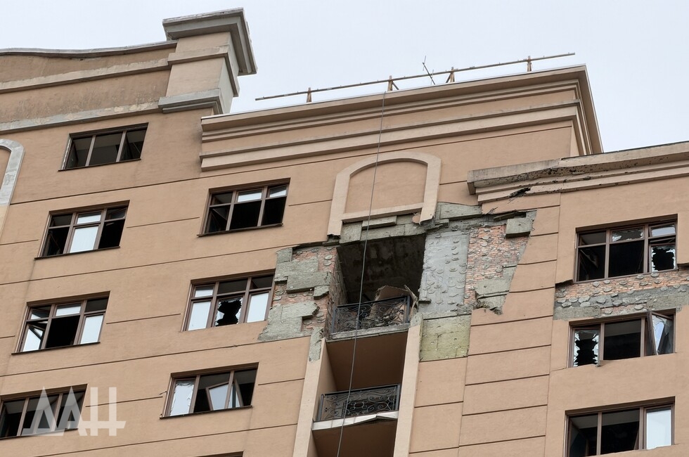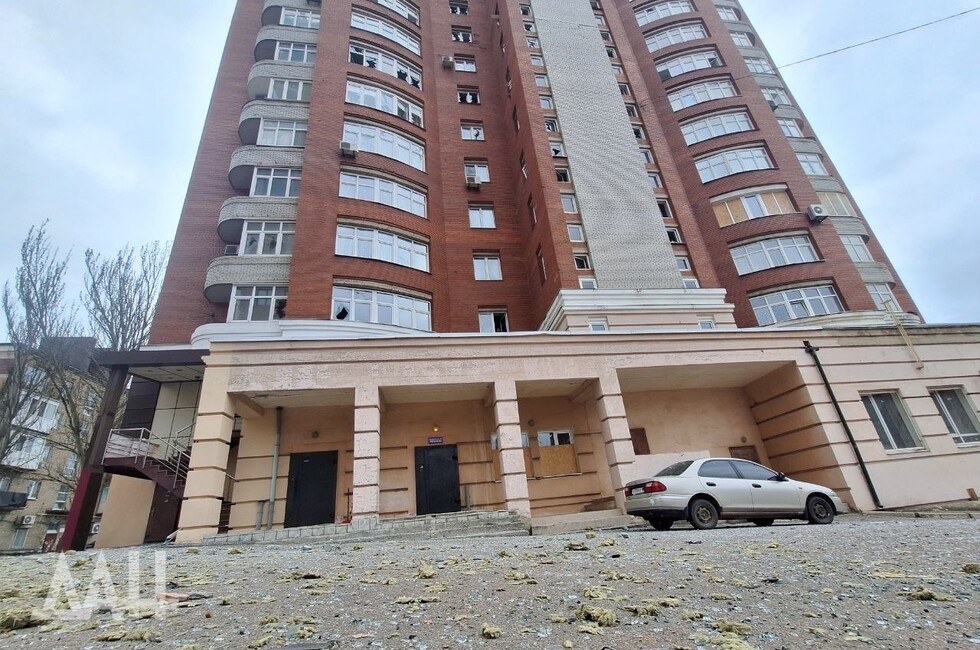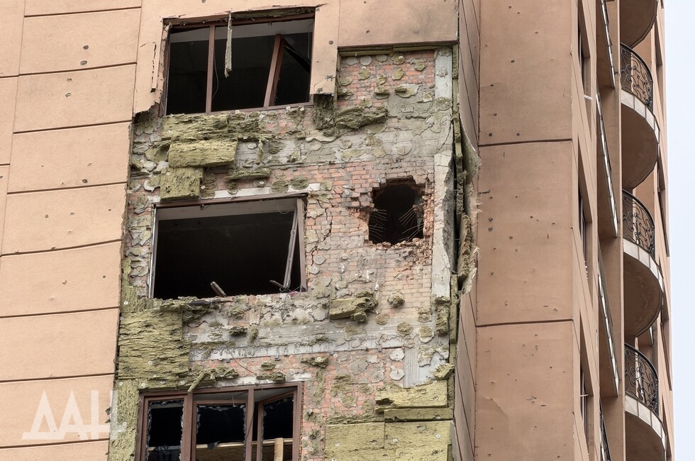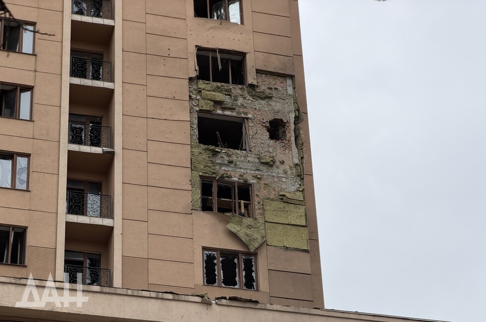 Под удар попало одно из зданий в центре столицы ДНР, в стене которого образовалась пробоина, нарушено остекление. Рядом с ним находится детская площадка, куда посыпались обломки обшивки здания. Повреждены и соседние многоквартирные дома. Там в основном выбиты стекла, а также подъездные двери.