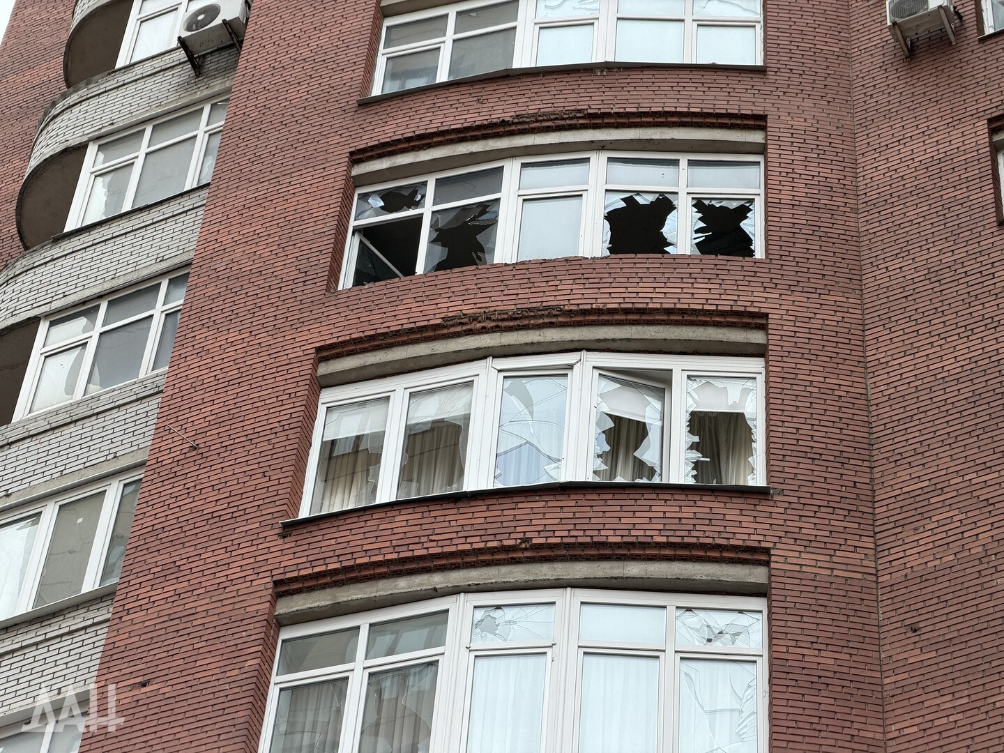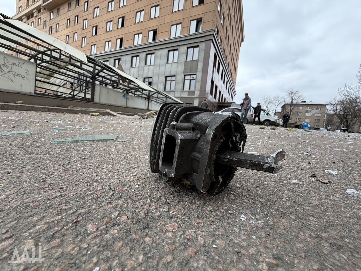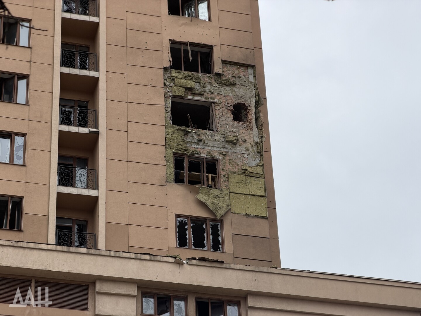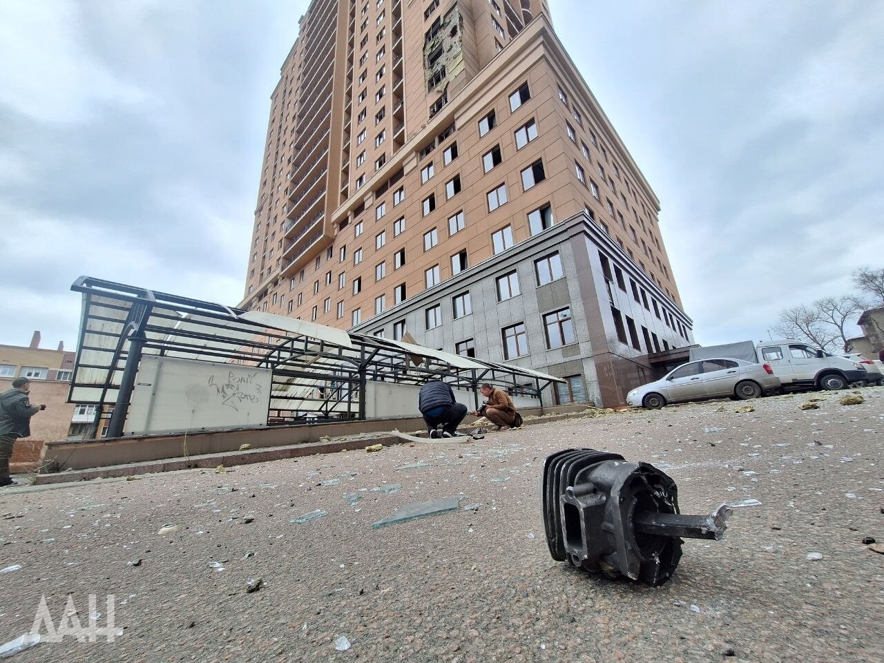 Под удар попало одно из зданий в центре столицы ДНР, в стене которого образовалась пробоина, нарушено остекление. Рядом с ним находится детская площадка, куда посыпались обломки обшивки здания. Повреждены и соседние многоквартирные дома. Там в основном выбиты стекла, а также подъездные двери.