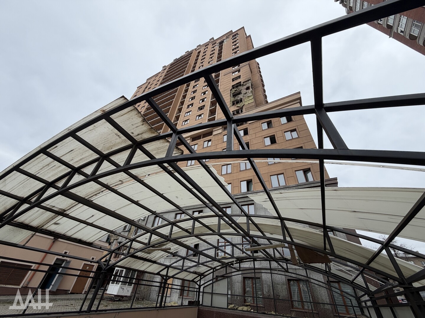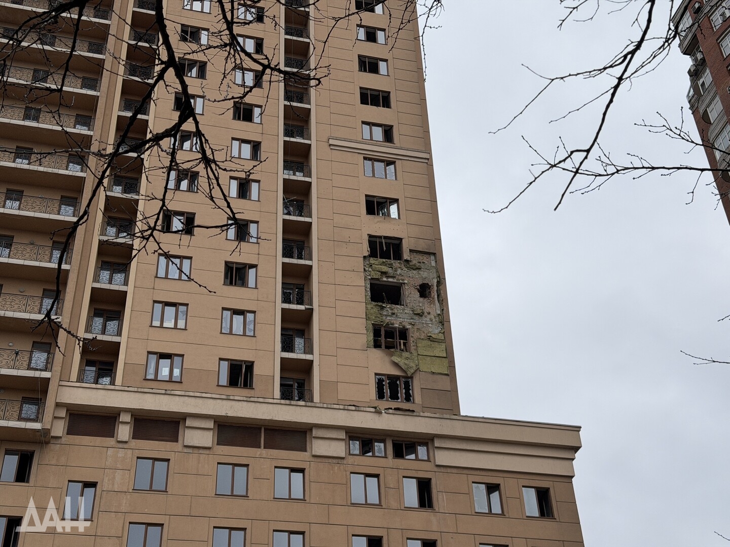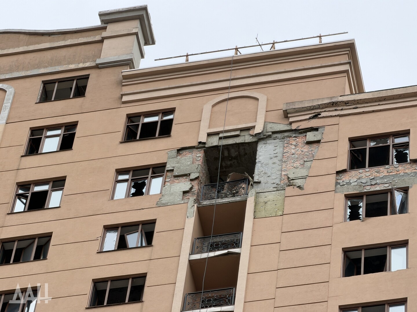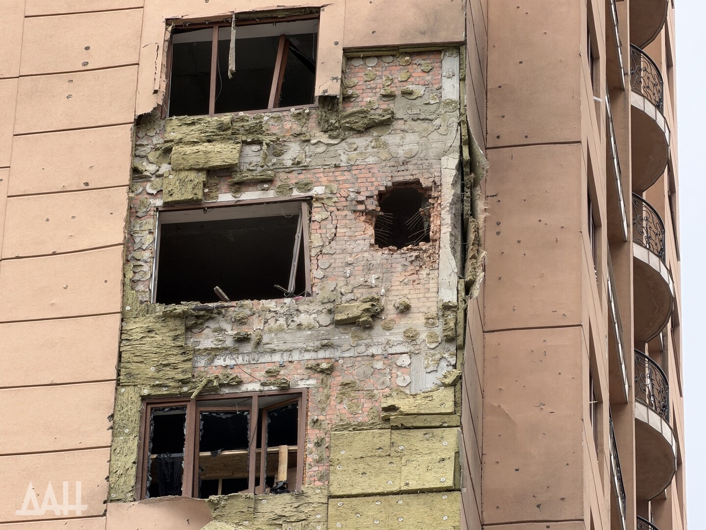 Под удар попало одно из зданий в центре столицы ДНР, в стене которого образовалась пробоина, нарушено остекление. Рядом с ним находится детская площадка, куда посыпались обломки обшивки здания. Повреждены и соседние многоквартирные дома. Там в основном выбиты стекла, а также подъездные двери.