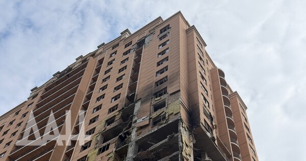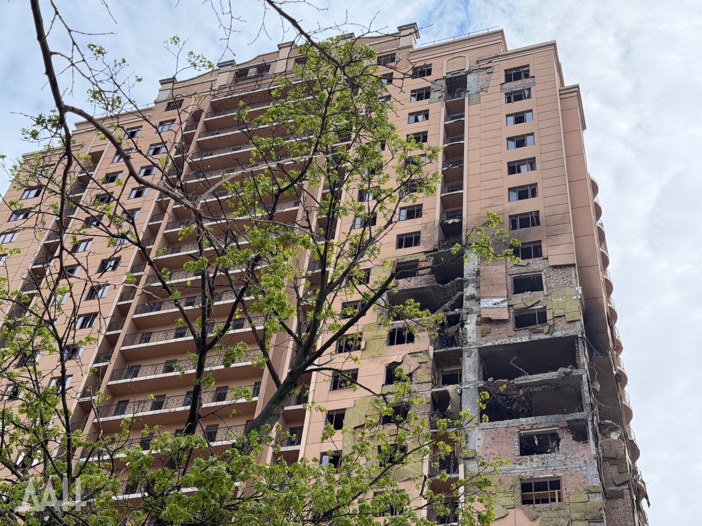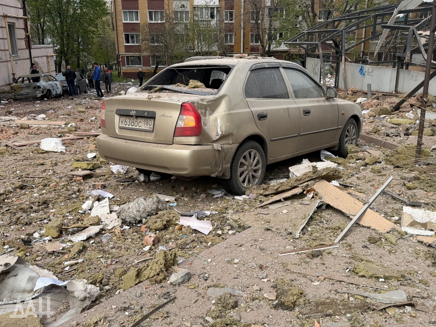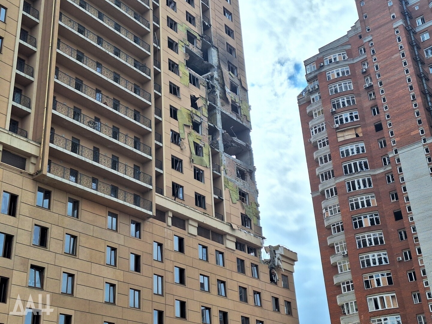 Удар был нанесён сегодня утром. Рядом с поврежденной высоткой сгорел гражданский автомобиль, разбиты и другие машины мирных жителей.