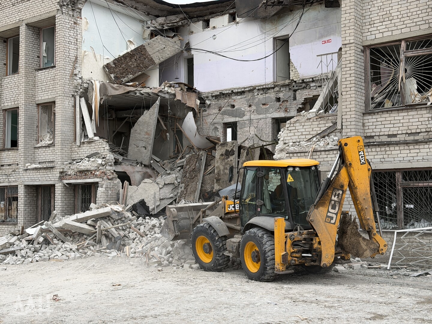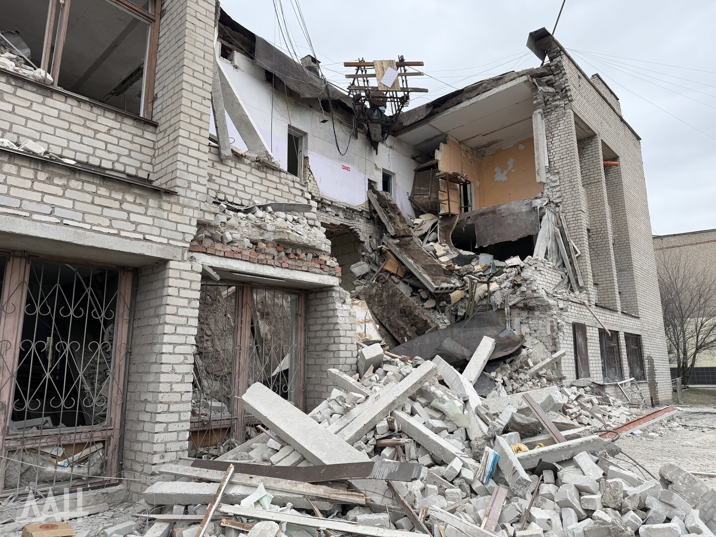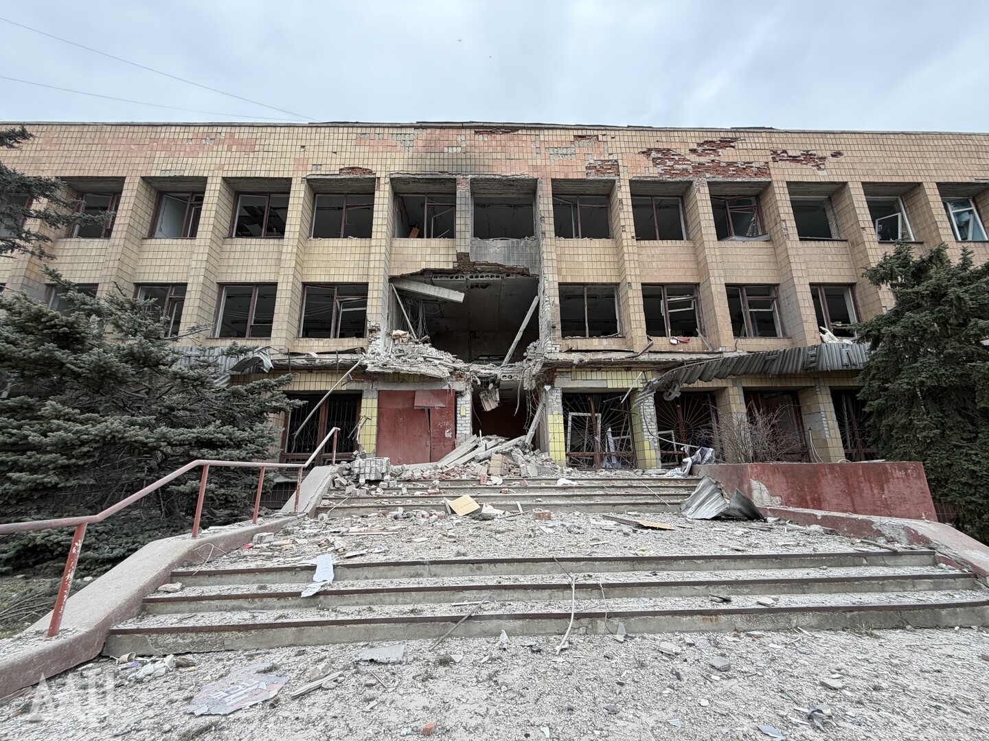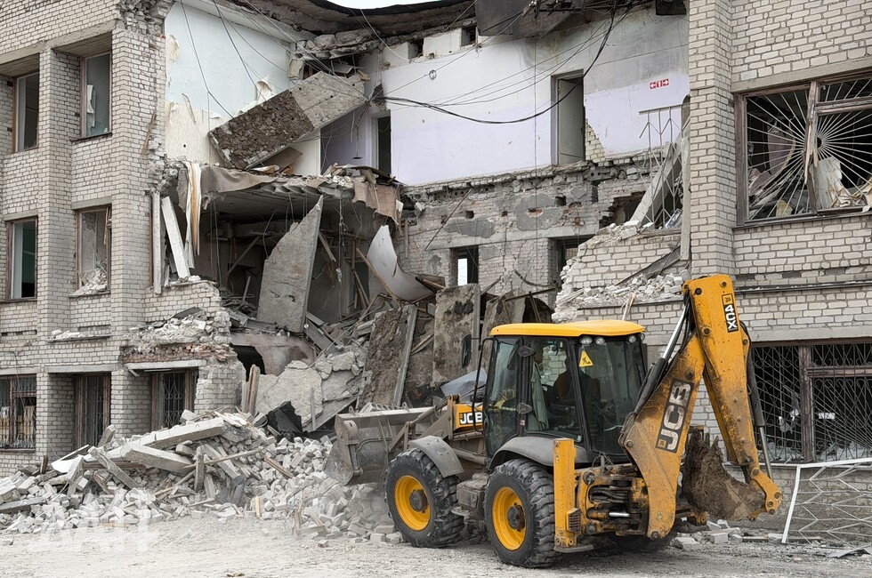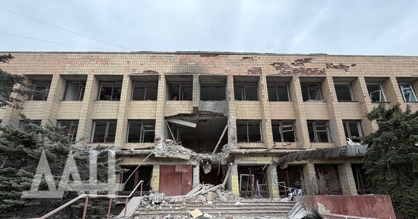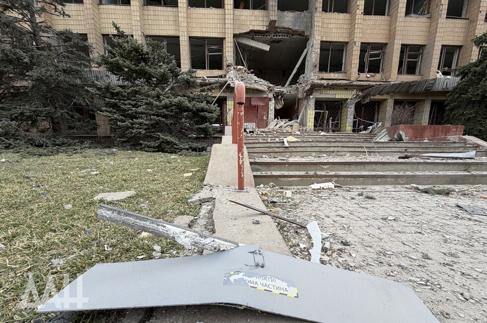 Здание высотой три этажа. Один из беспилотников ударил с лицевой стороны, в результате чего стена на втором этаже частично обвалилась, перекрыв вход. Также обрушился козырек над входом. С задней стороны здания обрушились кровля, бетонные плиты перекрытий двух этажей. Для разбора завалов задействовали трактор.