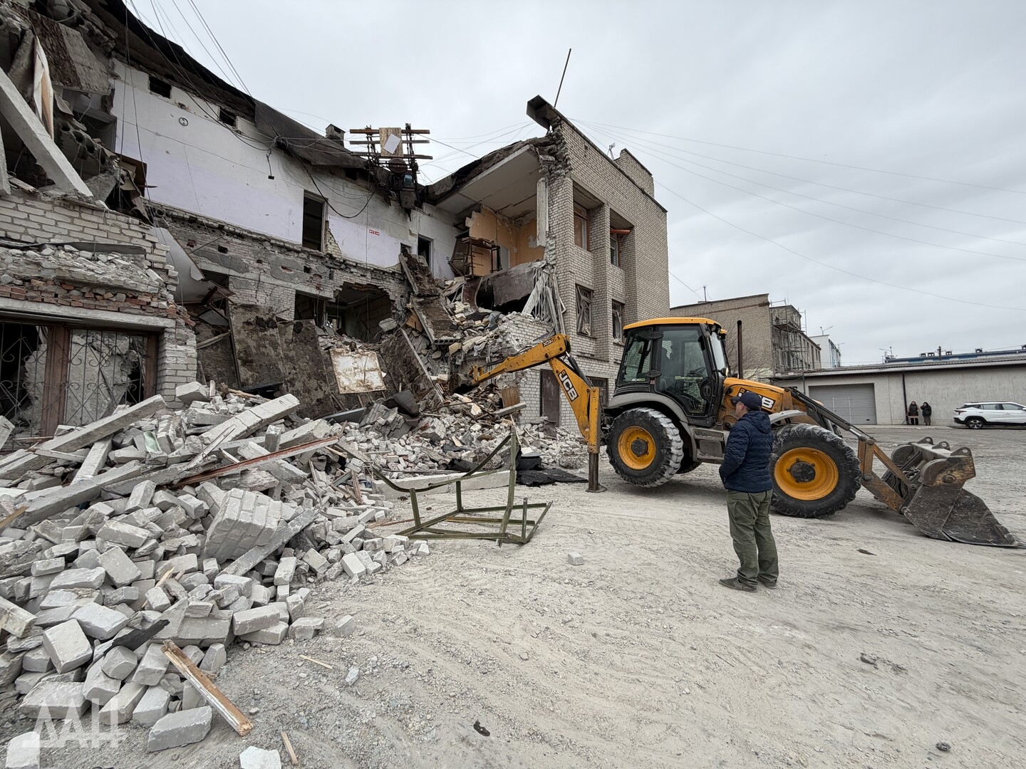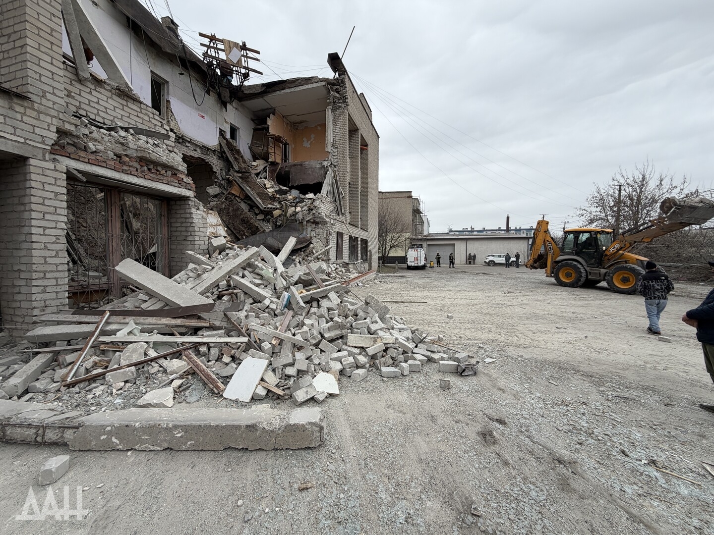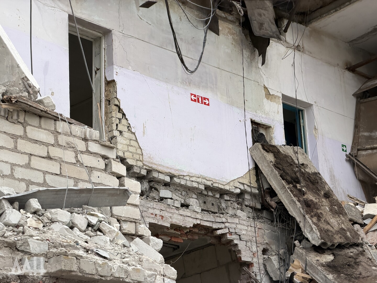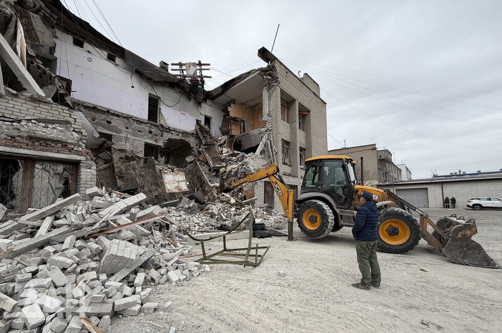 Здание высотой три этажа. Один из беспилотников ударил с лицевой стороны, в результате чего стена на втором этаже частично обвалилась, перекрыв вход. Также обрушился козырек над входом. С задней стороны здания обрушились кровля, бетонные плиты перекрытий двух этажей. Для разбора завалов задействовали трактор.